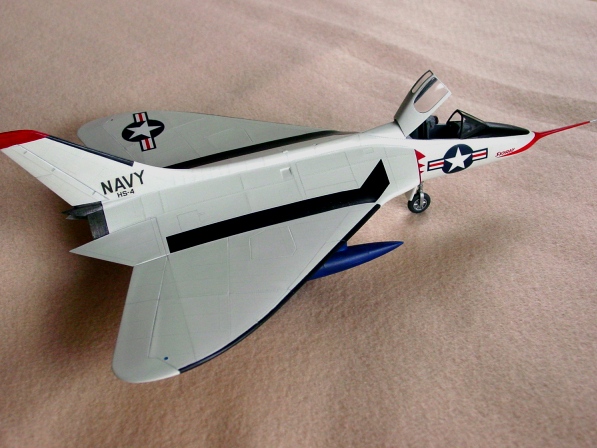 主翼は上下部品を接着し、動翼を接着するだけ。「だけ」なのだが、主翼と動翼の厚みが合わないので、これは上面重視で位置決めする。もちろん、胴体から主翼への面のつながりがスッキリと合うはずはなく、ここはそれなりに削り合わせる。その際、表面のモールドは出来る限り残し、50年代の味わいを大切にする。ロケット弾は趣味が合わないのでパイロンのみ付けることにした。 風防はちょっとだけ長すぎるようだ。そこで切断して開状態にすることで前後位置を決めた。真ん中を抜くことで、寸法の長すぎをごまかしたということ。 |