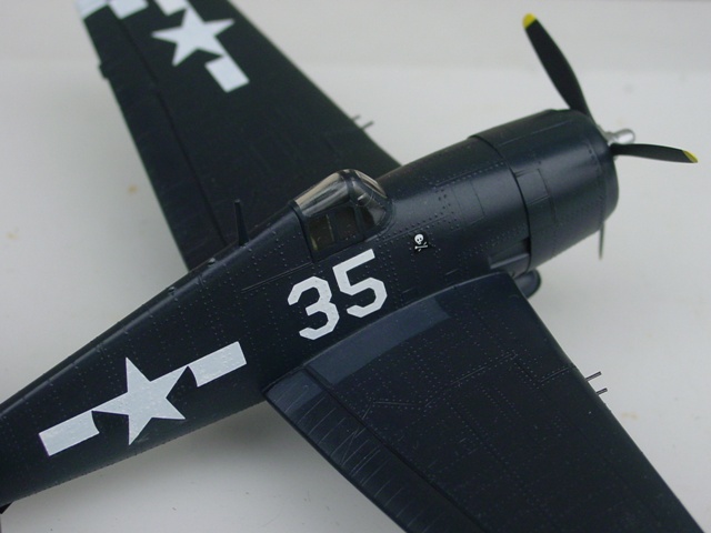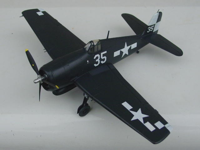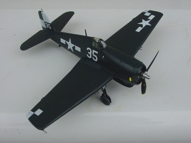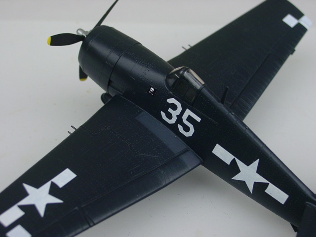 垂直安定板は前縁の側面形を削って修正、アンテナは真鍮線に代えて丈夫にする。主翼端は前方の角を丸める。水平尾翼にあるエレベーターのモールドは“ちょっとどうかな”と思うところもあるが、これも紺色に塗ってしまえば気にならないだろう(そんなところはあちらこちらにある訳だし)。40年前に穴をあけてしまった風防は、今回はキットのまま使う。このトンガリがフジミらしさなのだから、懐古趣味的にはこれでよいのである。 ただし3型の窓枠なので、塗装で5型にする。プロペラは薄く削り、取り付けの際にやや下向きに固定して、エンジンにダウンスラストがあるような感じにする。タイヤが薄くて貧弱なのにはガッカリした(もちろん知っていた)が、それがフジミのヘルキャットなのだから、そのまま使うことにした。私は爆弾を付けなかったが、爆弾のフィンの薄さは見事。今日でも間違いなく一級品である。