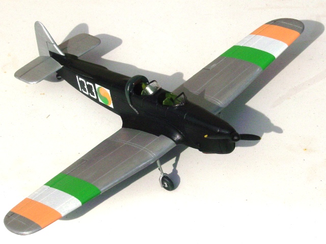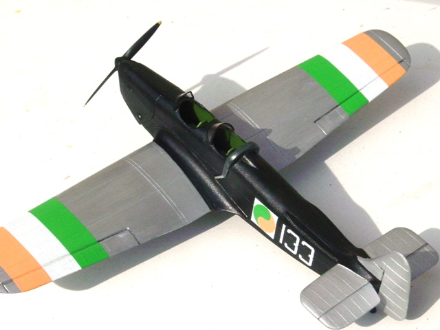 エルロンとエレベーター、ラダーは、どれも別部品なのだが可動ではない。軽く接着面を均して翼にくっつける。ところが水平尾翼は取り付け部分がマズくて、強い前進角がついてしまう。切って修正したのでは水平尾翼が小さくなりすぎるので、楔形にプラバンを挟み込んで修正した。あとは、なんとなく組んでいけば形になる。風防は塗装後に付けたのだが、胴体の形とはそれなりに一致していたので助かった。水性ボンドで、そっと置くように付けてある。