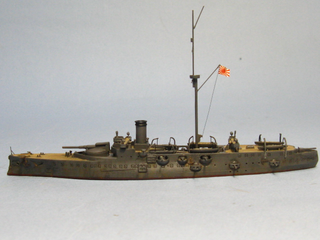 日清戦争前、清国の30.5cm砲4門を搭載する強力な戦艦「定遠」と「鎮遠」に3隻で対抗するため、32cm主砲1門と12cm副砲11門、魚雷発射管4基を装備する4000tの巡洋艦「松島」と「厳島」をフランスで、「橋立」を横須賀で建造して(日本)三景艦と呼ばれた。しかしボイラー不調に苦しみ1894年9月の黄海海戦では3艦合わせて13発発射して命中弾もなく主砲が故障、被弾しながら何とか副砲で応戦した。捕獲された以前のライバル「鎮遠」とともに第3艦隊を編成して、1905年5月の日本海海戦に参加している。 艦首に主砲を装備する「厳島」と「橋立」は、後部甲板や魚雷発射口などの違いだけなので一緒に製作すると楽だ。それまでは船体と煙突が黒、上部構造物が明るいグレーだったが、1904年1月に連合艦隊司令長官から黒1:白3の濃い鼠色への塗り替えが命じられているので、時期によって塗装やマストなどが異なるので注意しよう。