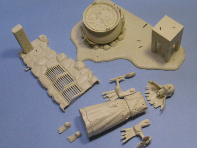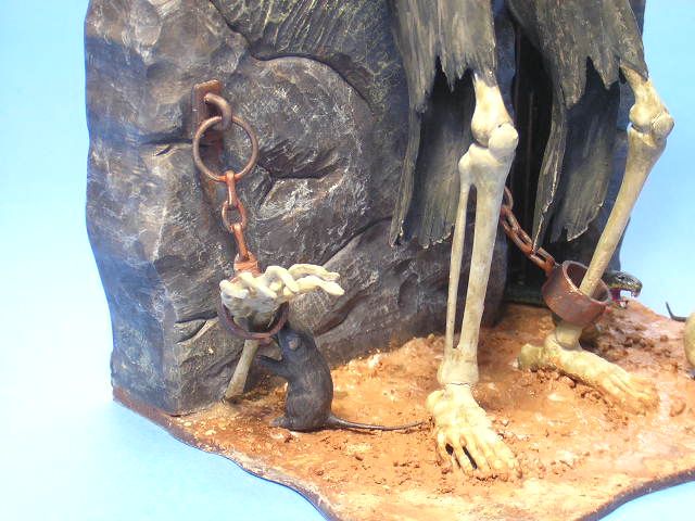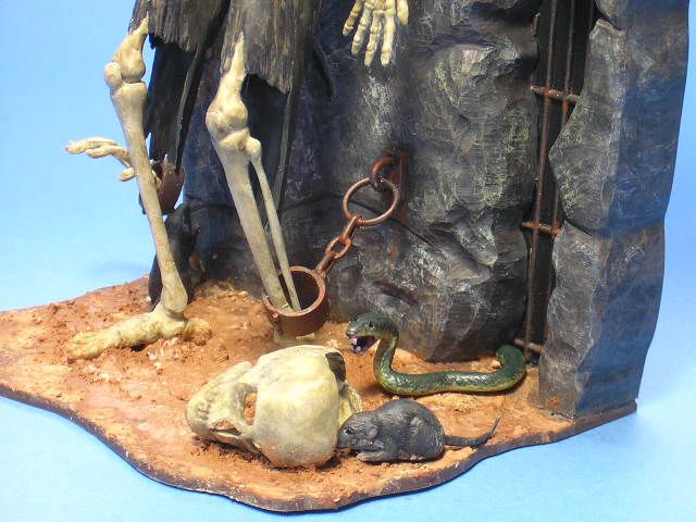 以前BBSに投降したオーロラの絶版Forgotten Prisonerは一時とんでもないプレミア価格でオークションに出品されていたが、作りかけでパーツも一部欠損して説明書もないオーロラ版を運良く安く入手できた。幸い瞬着を使用してなかったのでパーツを分解して整形しながら組み立て、鎖の中心を開口して欠損していた左下の手と右下の骸骨はメビウスのホラーパーツから流用する。足元のフラットな地面は園芸用砂利とファンドでそれらしく手を入れた。 |