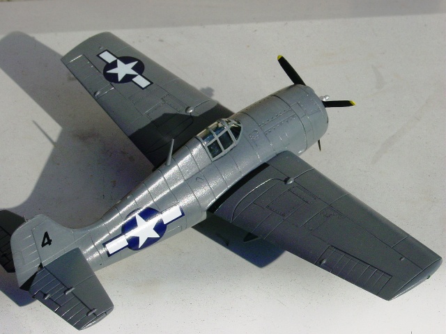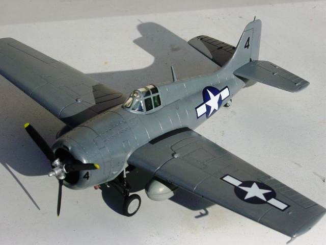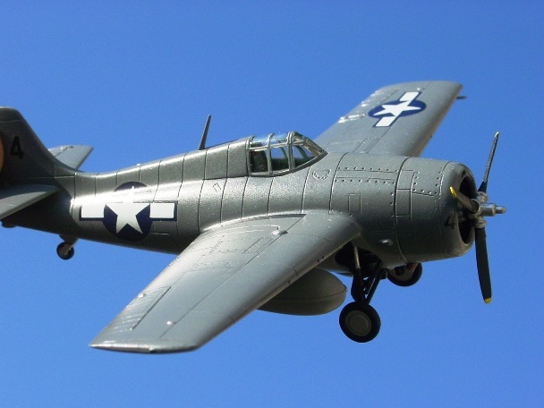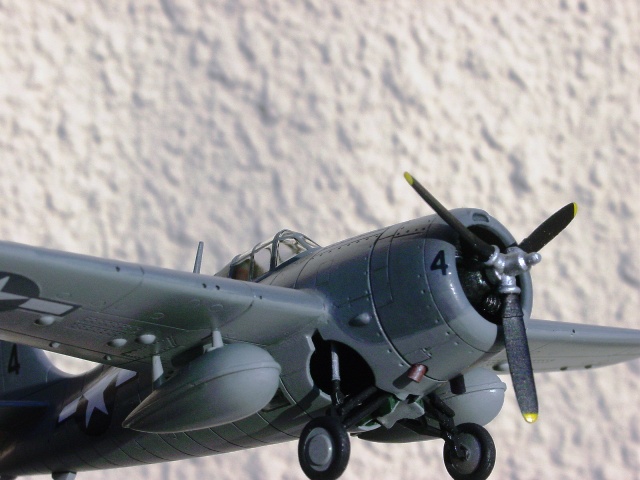 水性塗料は、皮膜がやや弱いこと、完全に乾くには結構長く時間がかかること、ある程度部屋を暖かくすることを意識すれば、特に塗るにあたって難しいことはない。今回、上側面のニュートラルグレイは、先に明るめの灰色を塗り、その後に暗めに調整した灰色を薄く重ねることで、色に味わいを加えた。凹線にはところどころ暗い灰色を入れ、逆に垂直尾翼の前縁や小さな凸部、カウルフラップの後縁などには明るい灰色をちょっと塗って、メリハリもつけてみた。凹線の「ところどころ」に暗い灰色を入れる理由は単調さを防ぐためで、ジグソーパズルの立体模型ようにしないための工夫。 |