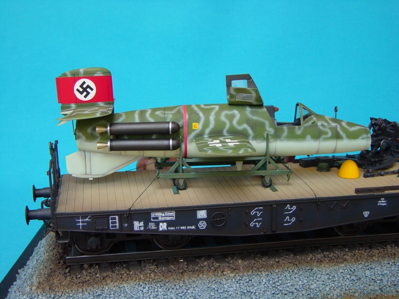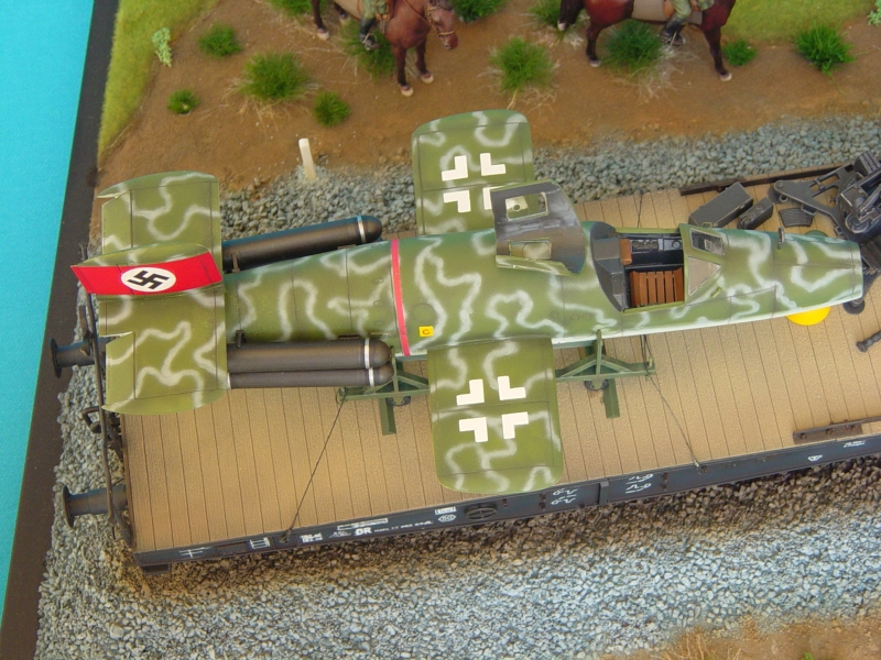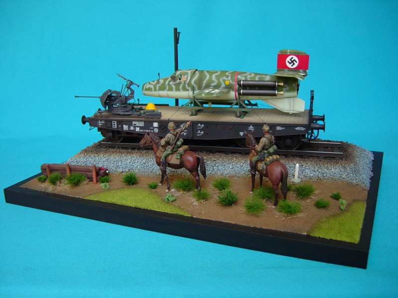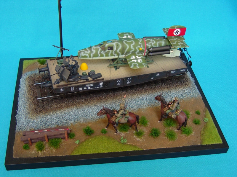 | さて作品の紹介ですが、貨車輸送されるドイツのロケット戦闘機?「ナッター」を主体に、それを見つめる騎乗の兵士のワンシーンです。「ナッター」1/35ですが全てプラ材で作成しており、ネットや雑誌などから資料を集めイメージを大事に作っております。 |