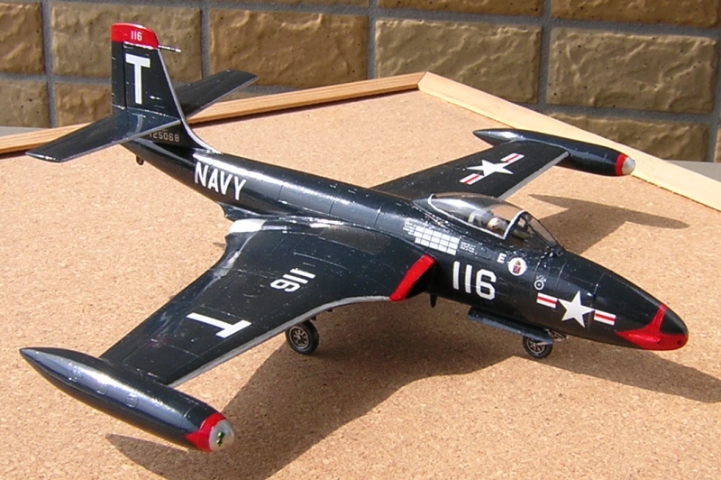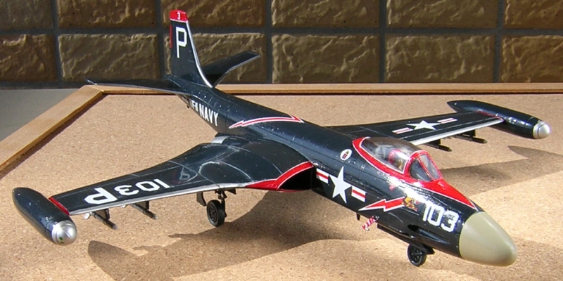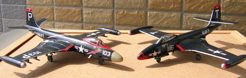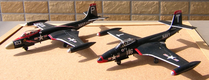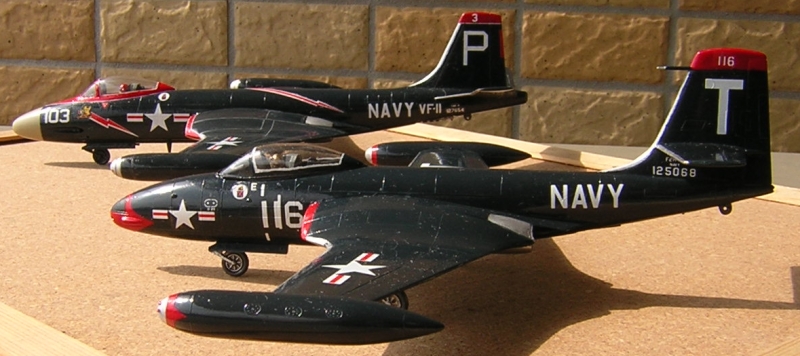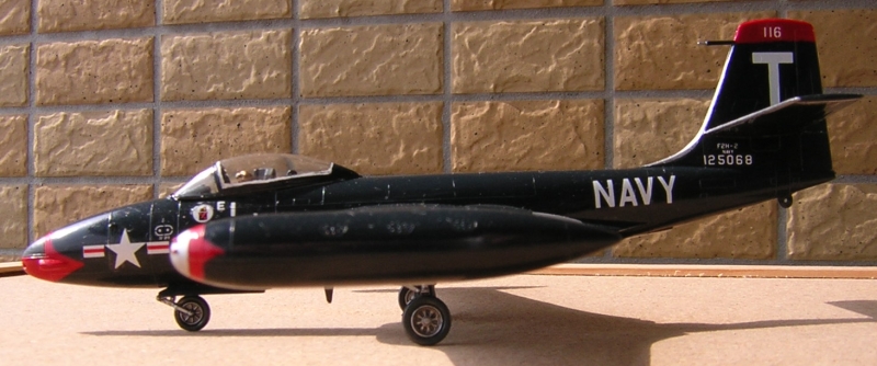 ただ塗装図のカラー指定がライトブルーになっているのですが、デカールの元になった実機写真を確認すると国籍マークの赤と同じ明度で写っていることや100番台のナンバーから考えてもやはり第1スコードロンの赤と考えるのが妥当ですので赤で塗装しました。今回F2H-2を製作してみてわかったのは側面から見ると機首からキャノピーにかけてのラインがP-80にそっくりなことです。 |