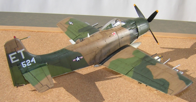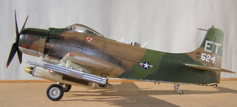次はスカイレイーダーです。実はこのキットが発売されたばかりの時にVA-176の有名な蜂マークで製作したのですが震災の時にかなりダメージを受けてそのままとなっておりました。今回はそれらを直しつつ空軍型にリメイクしてみました。といってもお気楽モデリングですので座席の変更やホイールハブの変更、ホイップアンテナの追加とかオミットさせていただきました。 その代わり塗装には力をいれてみました。いつも通りにMr.カラーでまずベトナム迷彩を塗り上げそこからタンは退色が一番激しいので同色にセールカラーを入れたものをドライブラシの要領でわざとむらになるようにこすりつけました。