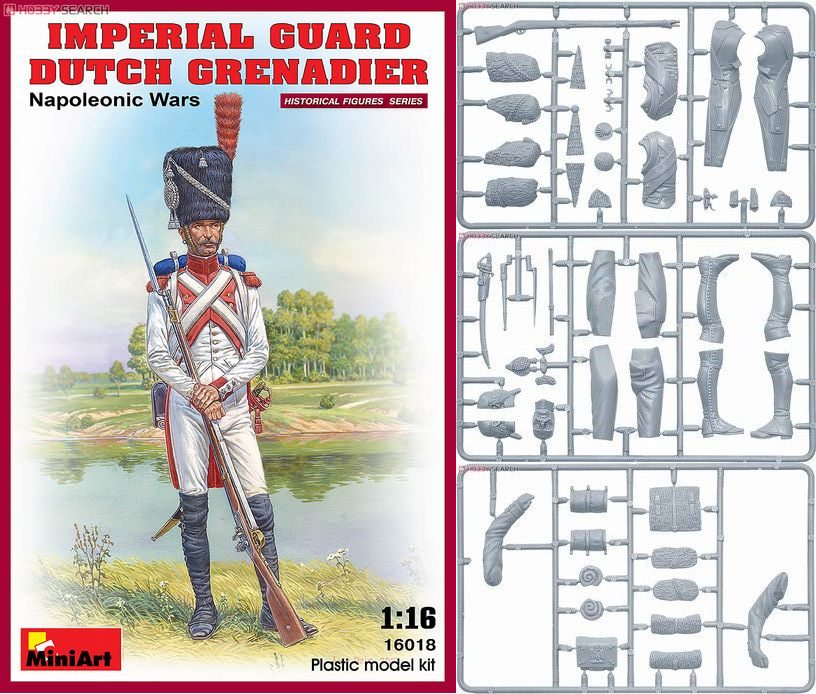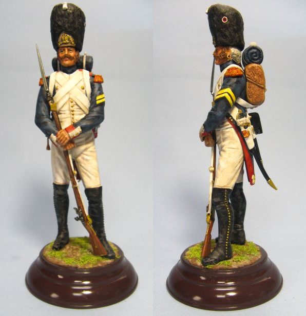 | 1789年に起きたフランス革命において干渉する対外戦争に活躍して自ら皇帝となったナポレオンは、砲兵の火力と騎兵の機動力を生かした強大な軍隊を作り上げ、合理的な戦略によりヨーロッパを席巻した。直属の親衛隊は歩兵、騎兵、砲兵、憲兵などの兵科があり、征服、併合したポーランドやオランダなどの外人部隊も含まれる。ナポレオンの弟ルイが国王となったオランダから1810年に親衛歩兵第3連隊が編成されたが、1812年10月のドイツ遠征で壊滅した。親衛歩兵はオールド(老)、ミドル(中)、ヤング(若)に別れ、オールドガードは重歩兵グレナディア(擲弾兵)と軽歩兵シャスール(猟兵)のみだが、他にもフュージリア(戦列兵)、ティラレール(狙撃)、ボルティゲール(銃兵)などで構成されて制服や装備も異なる。その中でも常にナポレオン本営にあり精鋭予備兵力の切り札である老親衛隊の兵士は、1799年11月に統領護衛隊として発足、大柄な歴戦の古参兵は熊の毛皮帽を被り死も恐れない勇猛さで、威圧的な姿とともに勝利を決する象徴として敵味方に知られていた。当時の慣習でカツラとイアリングを着用した老親衛隊は、1815年6月15日最後のワーテルロー戦に擲弾兵4140名と猟兵4600名の8個連隊が参加して18日に全軍が敗退する中、降伏を拒んで名誉ある徹底抗戦を選んで全滅した。 |