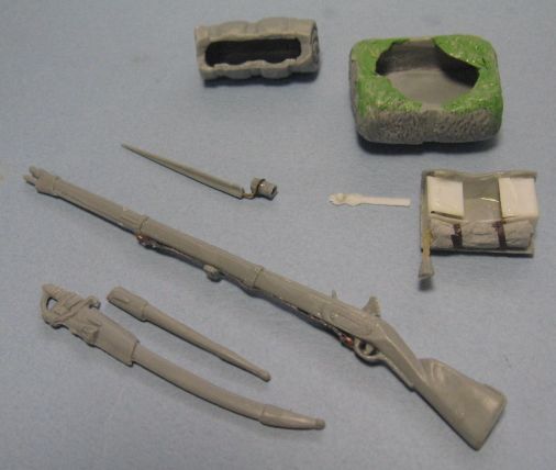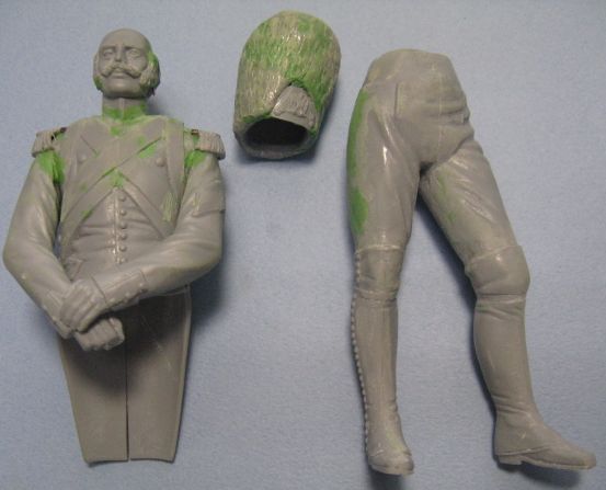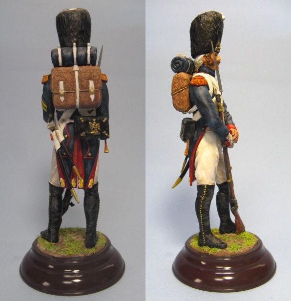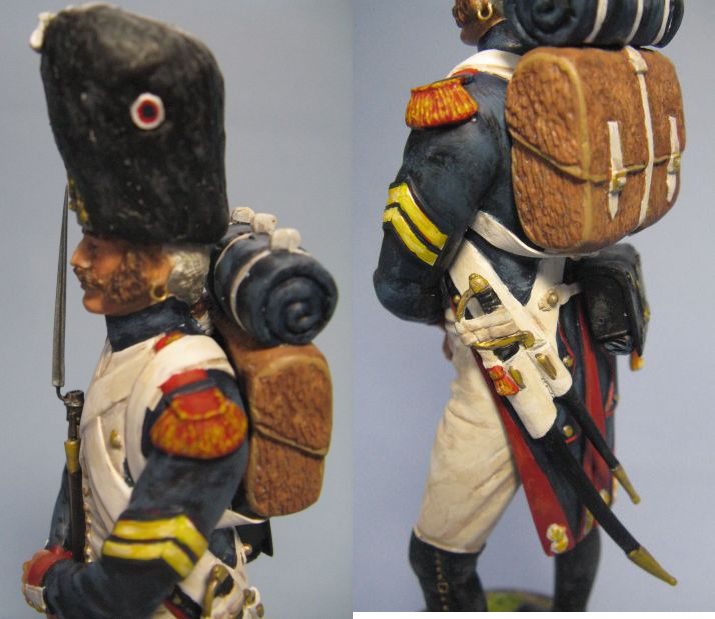 ウクライナのミニアートから1/16スケールのヒストリカル・フィギュアの魅力的なキットが発売されているが、メーカーの発表する完成画像と異なりキットは細部や出来が劣るのが残念です。今回は派手な軍装で知られるナポレオンの親衛隊からオランダ人で編成された第3連隊の擲弾兵が発売されたが、パレードなど礼装用の帽子羽飾りがお粗末であご紐もないので、各部に手を入れて老親衛隊の戦闘時の姿に変更してみました。帽子の飾りを削ってからパテで修正して前のプレートや左のコケイド(円形国旗)を取り付け、弾薬ポーチ下部の略帽をパテなどで作り、パック内部が見えないようにプラ板で塞いで下部負い帯をプラ板に替え、銃剣と小銃スリングを作り直します。コート後部のポケットは外側のパイピングを消し、レギンスのバンド金具をエナメル線で追加しました。弾薬ポーチと剣吊を繋ぐストラップを作ったが剣握りの飾りも垂直になるように直したかったですね。左袖に2本のシェブロンがあるので肩の赤いエポレット(肩章)に黄色い飾りが混じる軍曹とし、左耳にイアリングを追加しています。兵士の着用する服や装備は、当時の伝統を表しているので歴史などの資料を良く調べて製作しましょう。 |
