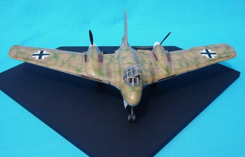 コクピットは資料を基にそれなりに仕上げ、キャノピーは塩ビ版ではなくプラ版で枠を作りそこへ透明プラ版をストーブの熱でアール状にまげて1枚ずつカットして全体を仕上げました。この作業はアールの曲げ加工がむつかしく、かなりの失敗を伴い苦労の連続でした。リモコン機銃部はプラ版の芯にエポキシパテを盛り付け乾燥後ペーパーかけ仕上げをしました。プロペラ(フジミ)、エンジン排気管(フジミ)、車輪(ハセガワ)などは加工が難しく既製品を使用しました。機体全体には資料に基づきそれなりに筋ぼりを施しました。 |
