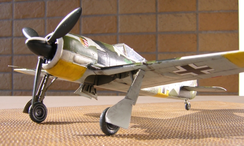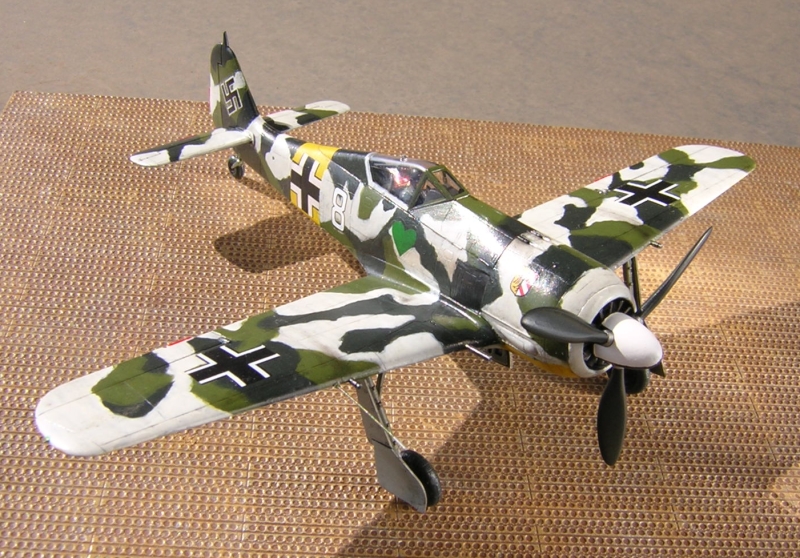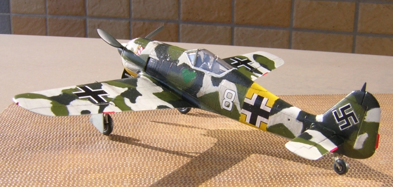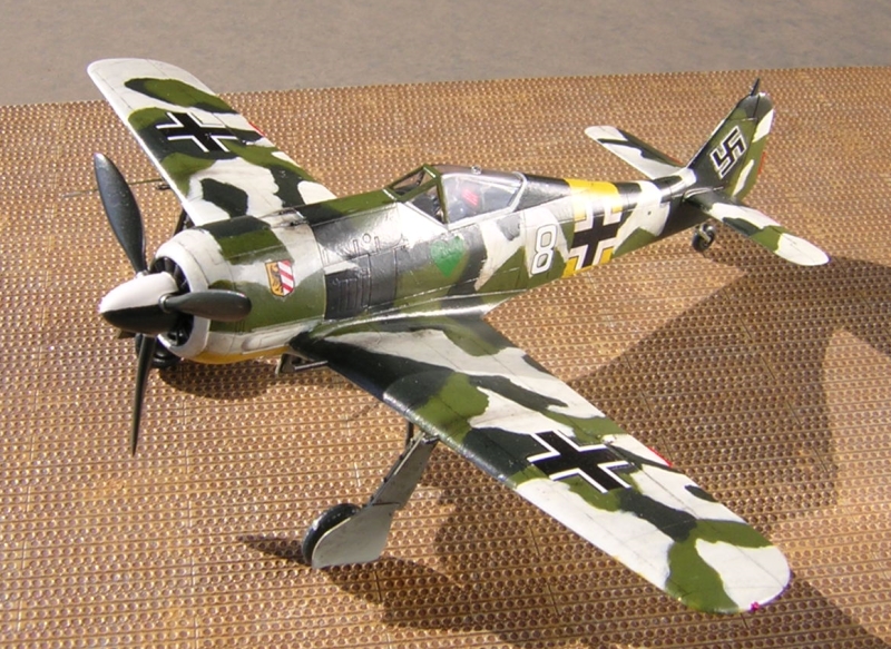 今回はブラックグリーンと明るめのグリーンは126番コクピット色(三菱系)を使ってみました。白はそのまま塗ったらきれい過ぎるのでベトナム迷彩下面色のグレーFS36622で汚れた感じを演出してみました。マーキングはエアロマスターデカールからノボトニーをチョイスしてみました。ノボトニーの白8番は上面全体白が有名ですが雪解け時にはこういう状態もあったのではないかと勝手にでっちあげました。後はいつものようにスミいれとパステルで軽く汚しを入れてセミフラットのトップコートで仕上げました。 |