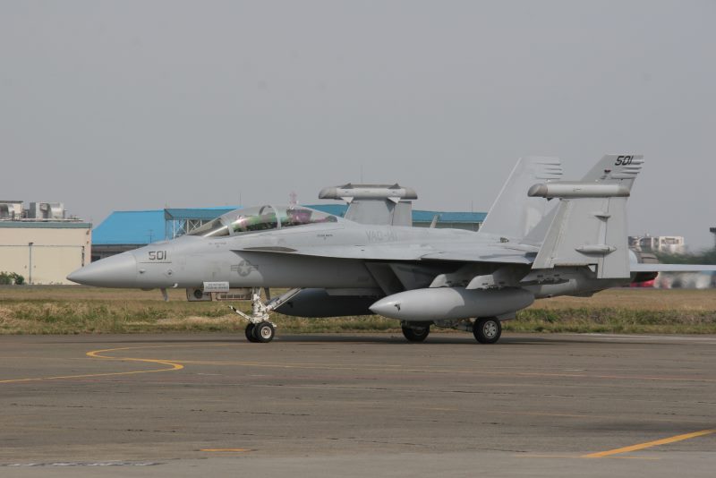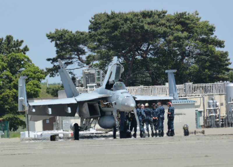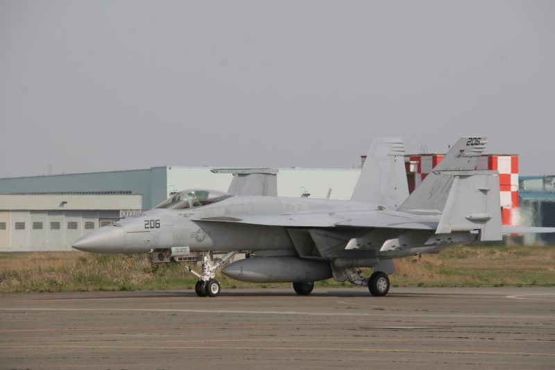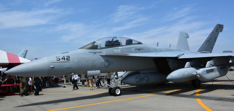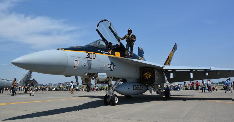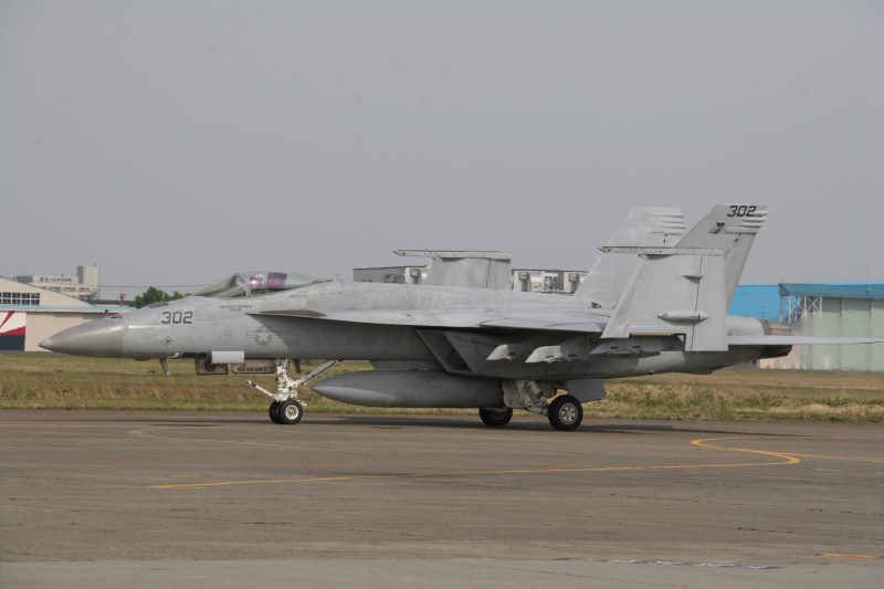 (写真14)  FA-18E 整備中のため、インテーク横の点検ハッチが開いている。