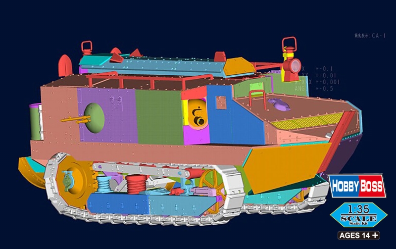 1914年に勃発した第1次世界大戦で使用され、活躍しました。主砲に9.5口径75㎜榴弾砲を装備し、8㎜ホチキス重機関銃を2丁備えていました。全長18.2cm、全幅9.4㎝、砲塔および車体下部はスライド金型により再現、連結組み立て式キャタピラ、パーツ数380以上、エッチングパーツ付き、新金型。