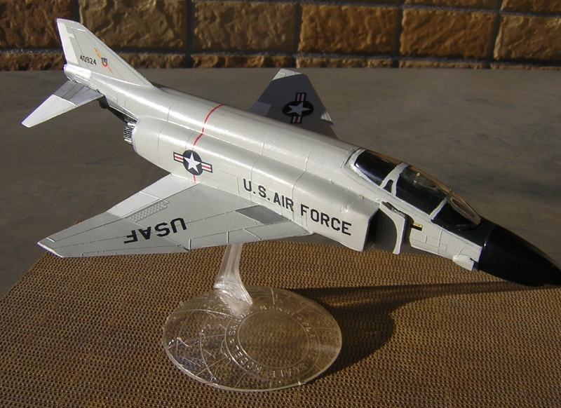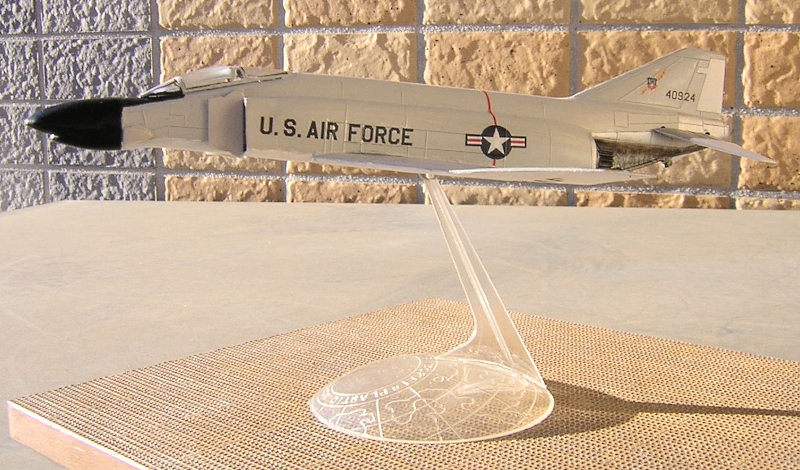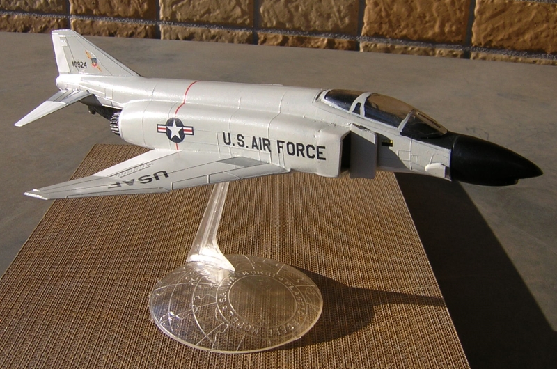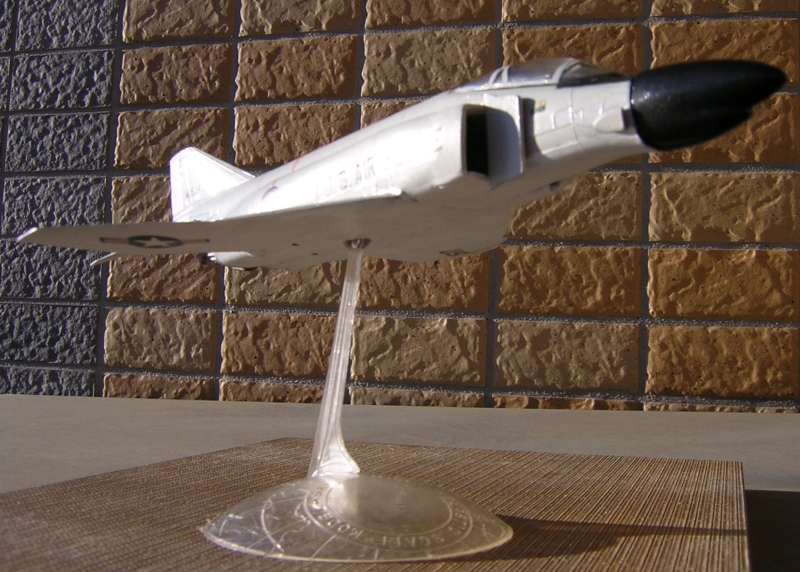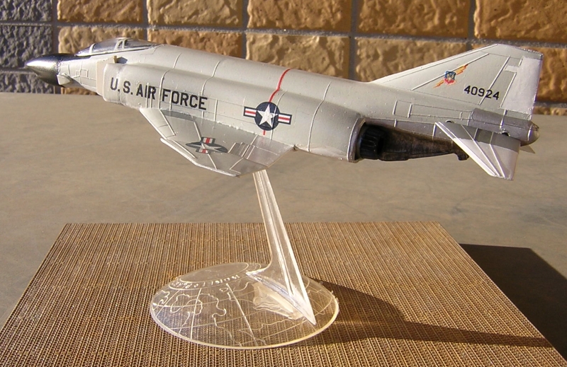 おそらく日本で初めて発売されたファントムのプラモデルではないでしょうか。橋本喜久雄氏の描いたすばらしい箱絵のボックスをワクワクしながら開けると中身にがっくりします。駄菓子屋玩具に毛の生えた程度のパーツがスタンドを含めて20点入っています。モールドは銀と黒の2色成型で脚関係のパーツは含まれておらずスタンドを使用した飛行状態のみです。ファントム自体は特長のある機体ですのでとりあえずファントムに見えるかなといった程度です。 |