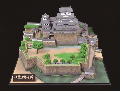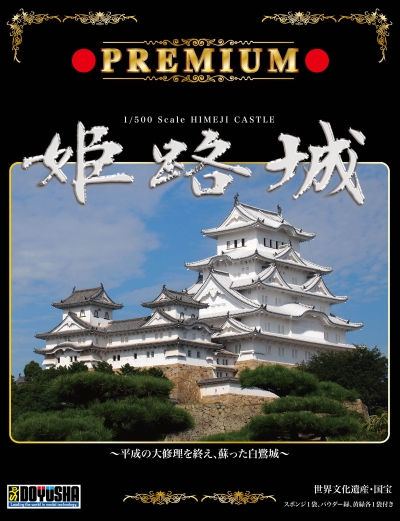 ④ 平成21年度より進められていた平成の大修理は昨年秋にほぼ終了し、姫路城は今年平成27年3月27日グランドオープンを迎えます。童友社では、このたび新設計、新金型にて新たに姫路城のプラモデルを開発しました。スケールは1/500、パーツ数約160、モデル完成寸法265×205×120㎜、備前丸を再現した大型のベースに大天守と東、西、乾の三つの小天守を渡櫓でつないだ連立式の複合天守をリアルにモデル化しました。城内を飾る樹木は、成形パーツをもとにスポンジとパウダーで作ります。スポンジ1袋、パウダー緑、黄緑各1袋付き、分かりやすいカラー版説明書付き。