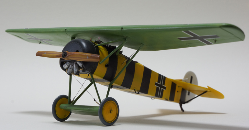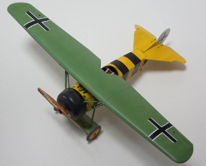 黄色と黒のミツバチみたいな塗装が気に入りました。箱絵からの推測ですので細部は違っているかもしれません。主翼の国籍マークは上下が繋がっているのが正しいようですし、 胴体から主翼への張り線は補強用ではなく補助翼の操作用が正解のようですが、修正は次回の宿題とします。eduarud版も機会があれば入手して作りたいと思います。