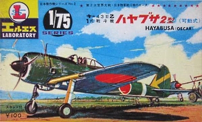 この隼2型は1960年代に隼1型より前にリリースされ、最初期はキャノピーとエルロンだけでなく、主脚も引き込み可動式だったと記憶しています。また、スタンド付でした。(下右写真箱絵)