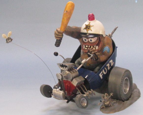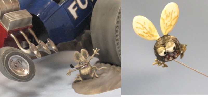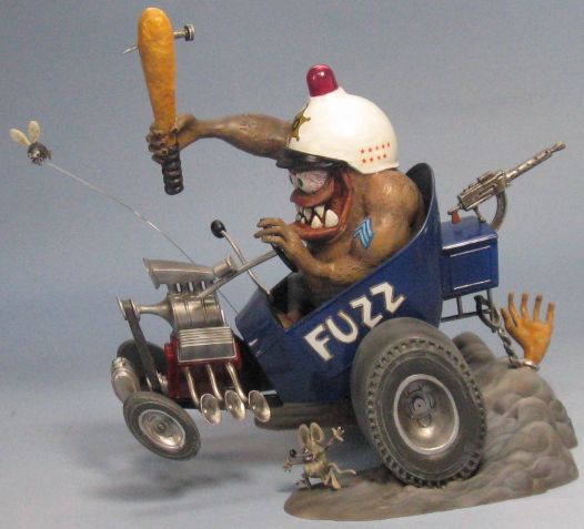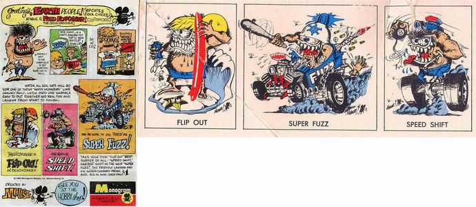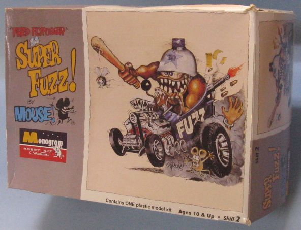 | 今月特集の「今はなきメーカー」ではないけど老舗モノグラムから1965年に“マウス”シリーズのモンスターが発売されていたが、すぐに絶版になり本国アメリカでも入手難の激レアキットになっています。60年代にカスタムカーのデザインやイラストなどで有名な、エド“ビッグ・ダディ”ロスの不気味な鼠“フィンク”やモンスター、カーモデルがレベルから1963年に各種発売されて大人気でした。エドと同じような帽子を被ったスタン・ミラーJr.がデザインしたモノグラムのアメリカン・ポリスのような「スーパー・ファズ」、サーファーの「フリップ・アウト」、車軸と一体化した「スピード・シフト」のキット3種は、エド・ロスのパクリとしか思えないキャラクターです。 |