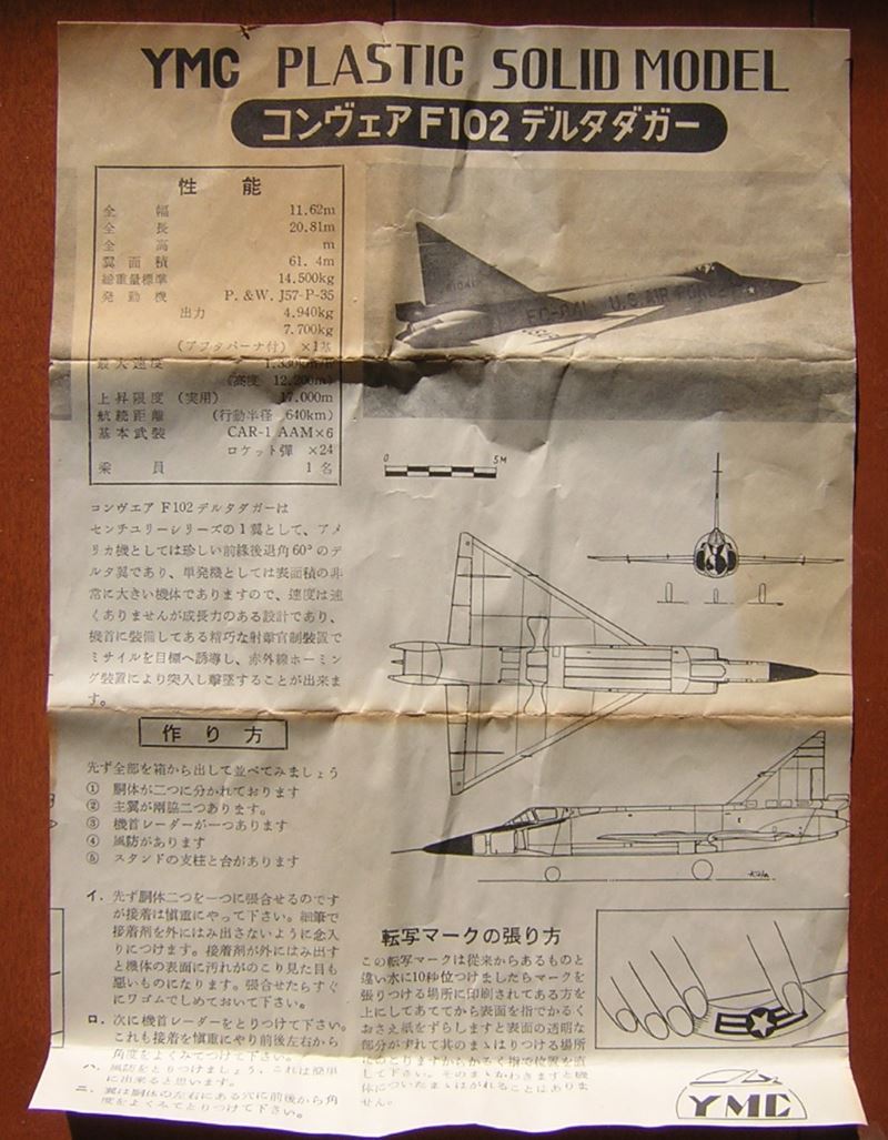 どうもヒサマロです。今回の温故知新シリーズは日本プラモデル創世記のメーカーYMC(山田模型社)のF-102Aデルタダガーを取り上げてみました。このメーカーはもともと木製ソリッドモデルの半完成キットを販売していたようですがマルサンがプラモデルを発売して後にプラモデルの方に移行してきたようです。 1/100で日本の複葉機をシリーズで出していたことは有名ですが私は現物にお目にかかったことはありません。