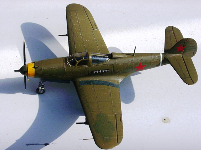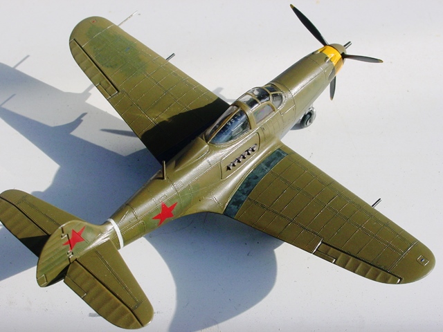 もはや冷静に対処する心情ではなく、これまた余りモノのソ連の赤い星に変え、問題の左上面は米軍マークを塗りつぶしたようにしてごまかしてみた。でも、下地にデカールの破片が残っているので、グチャグチャになっている。“まあイイや”とも思えないが、年間20~30機も作れば、こんなこともときには発生する。5月2~5日まで埼玉県所沢市の航空発祥記念館で開催のSLB展示会に、このエアラコブラも登場すると思うが、よく見ないでほしい(←展示会の広告に強引にもってきた)。 |