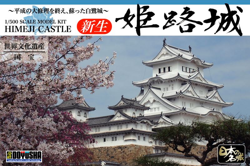 前日の26日には記念式典が開催され、「白鷺城」の別名通り、真っ白によみがえった天守の上空をブルーインパルスが祝賀飛行しました。青い空に白い城、上空にはブルーが描いた桜の花びら、という最高に美しい光景は世界中の人々を魅了したのです。童友社では、先にプレミアム姫路城を発売しましたが、この度その廉価版ともいうべき新生「姫路城」を発売いたします。スケールは1/500、パーツ数130、205㎜×155㎜のコンパクトなベースに姫路城をリアルにモデル化しました。別売りの「城の樹木」で樹木を追加して、より密度の高いモデルを作ってみましょう。