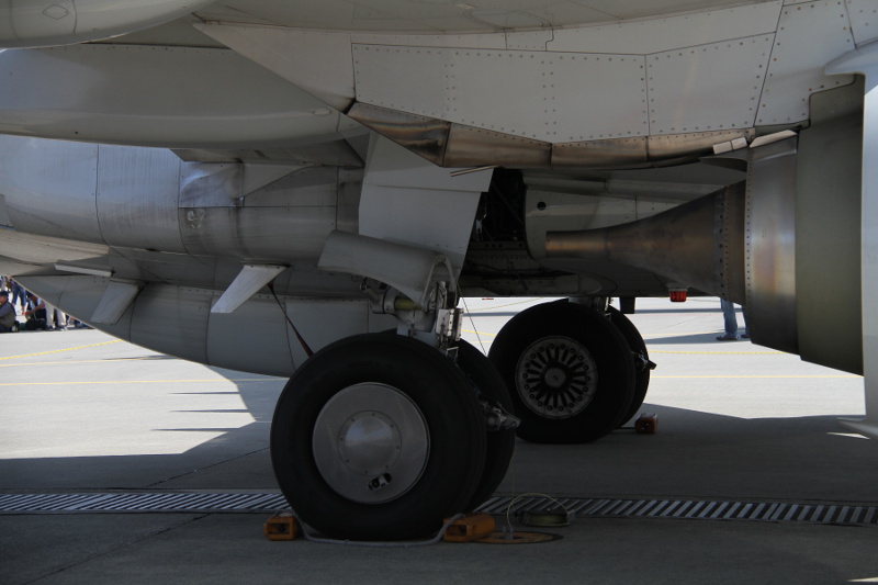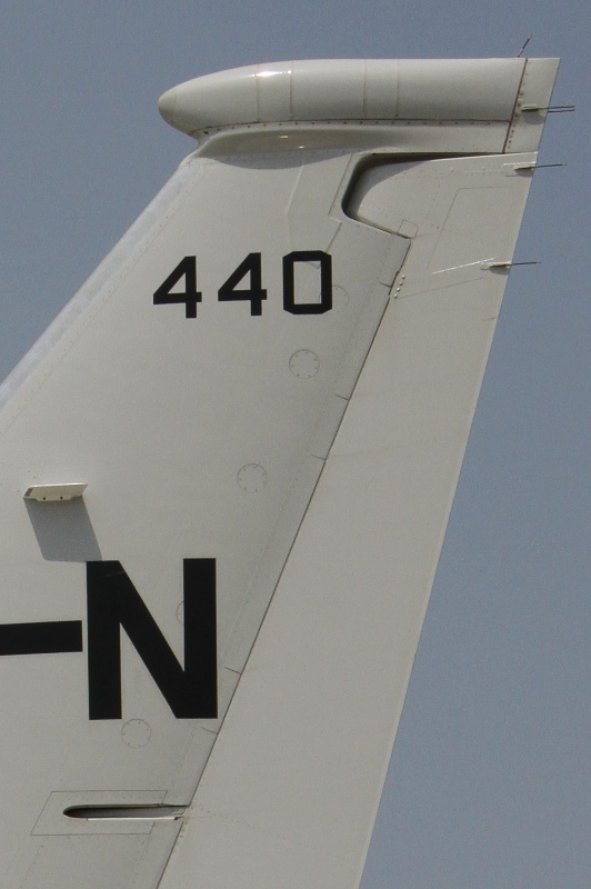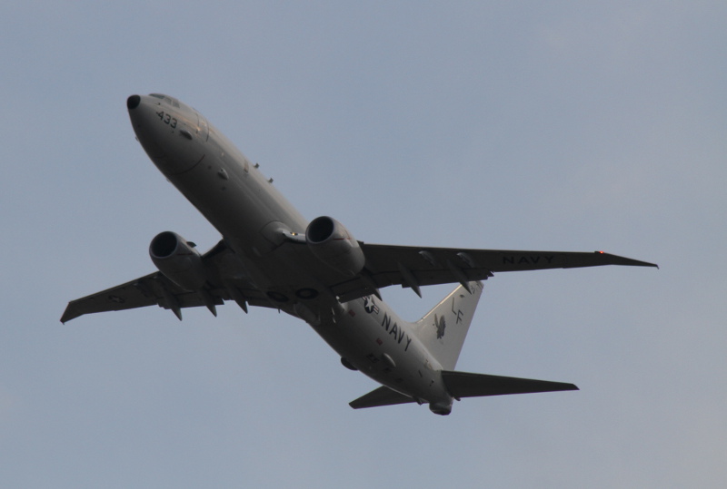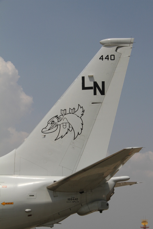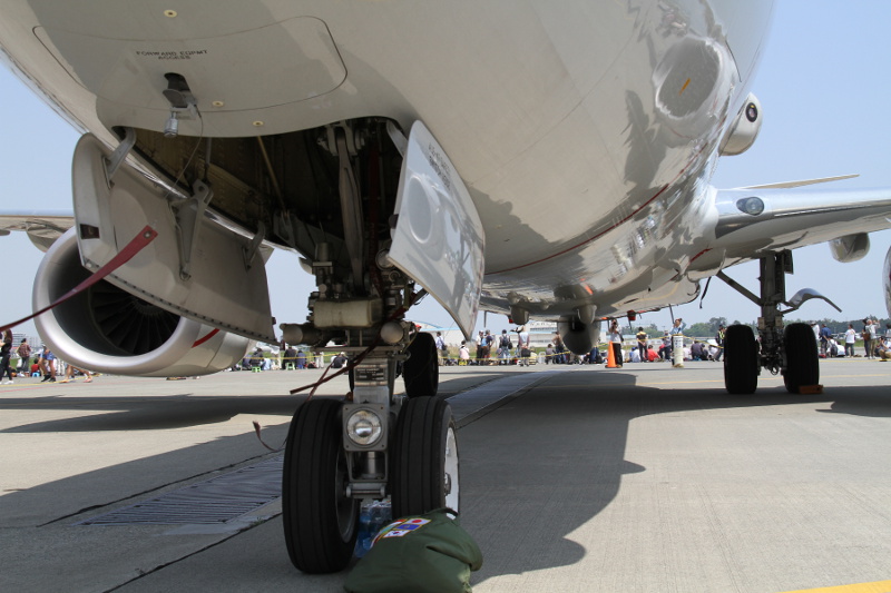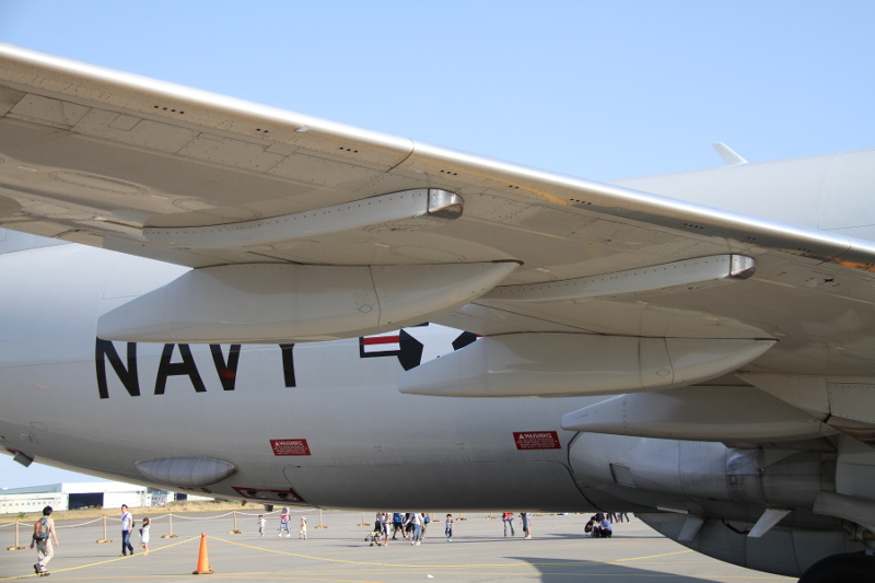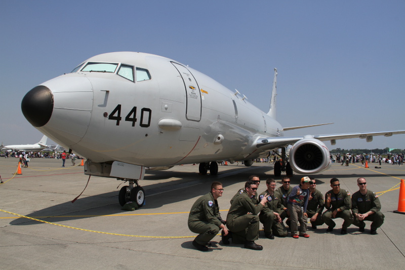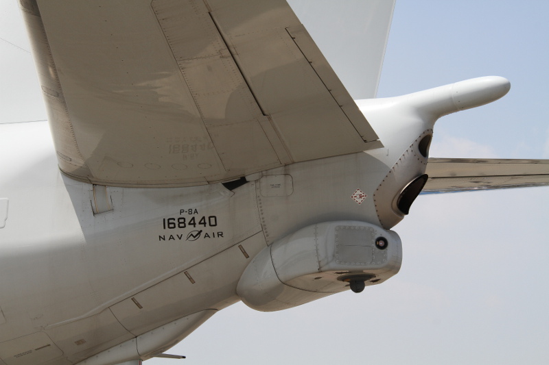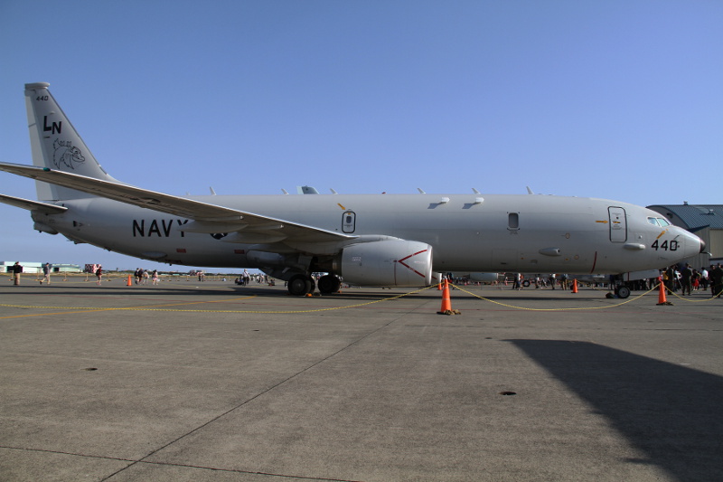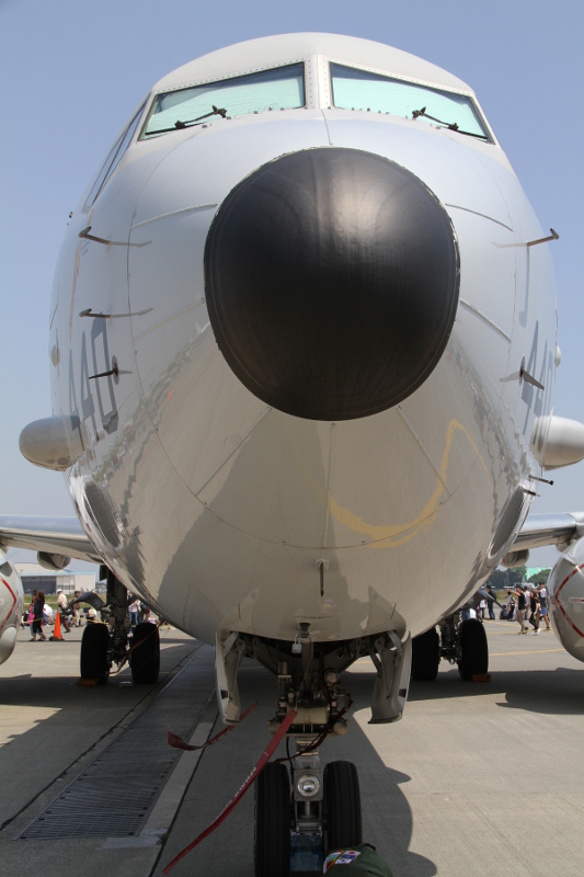| 丁度この日は、3月末付で海上自衛隊厚木航空基地の第4航空群第3航空隊へ初の実戦部隊配備となった日本の新鋭哨戒機P-1も並んで展示されたこともあり、両者の比較もできました。大きさはほとんど同じくらいですが、外観的にはエンジンが4発のP-1に対し、P-8Aは双発、P-1には潜水艦捜索用の磁気探知機(MAD)のブームが尾部に大きく突き出しているのに対し、P-8AはMADブームらしきものがお尻から突き出ているだけで、実際には重量軽減のためMADは搭載されていません。確かに計画時の図と比べると、このブームの長さは短くなっており、他のセンサーが収納されているのかもしれません。 |
