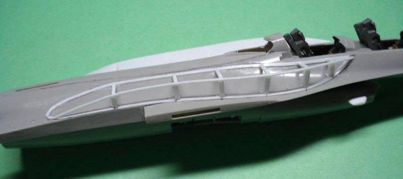 改造個所はF-16C型の従来の機体に燃料タンクを両サイドに2か所と背中に電子機器スーツと垂直尾翼の補強等になります。改造個所はイタレリのキットとICMのレジン部品を参考にプラ版とプラ棒を使い、プラ棒で骨組みを組立その上に0.5mmのプラ版を貼りつけていきます。