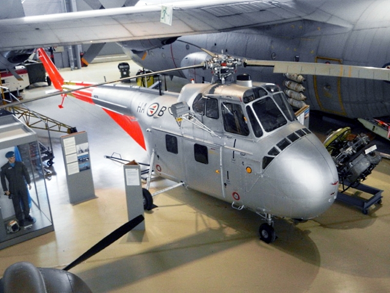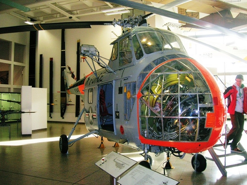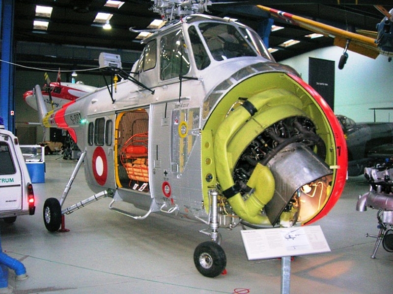 S-55は、600馬力のプラット&ホイットニー社のワスプ・レシプロエンジンを、機首に35度斜めに搭載する「コロンブスの卵」的新機軸で、大きな機内容積を確保する事に 成功しました。そのため、エンジンの搭載方法を「見せびらかす」展示の博物館も多く、 楽しめます。