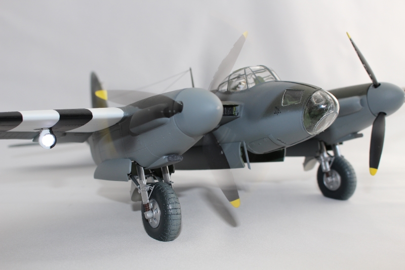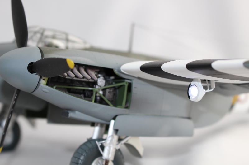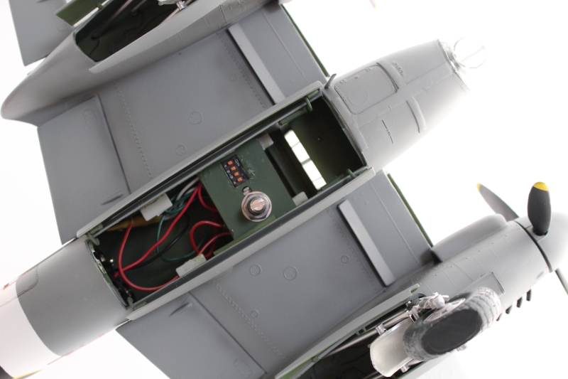 ランディングライトは展開状態としこのキットエンジンは左のみしか無く右は空洞でモータは左はエンジン内に右は直接カウルに固定しました。しかし最終プロペラ差し込む際にモータ後部のブラシ部のカシメ緩かったのか、モータ壊してしまいました。