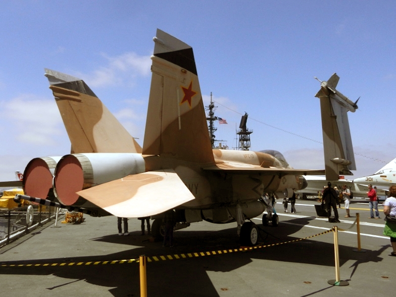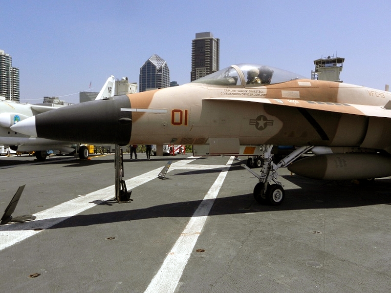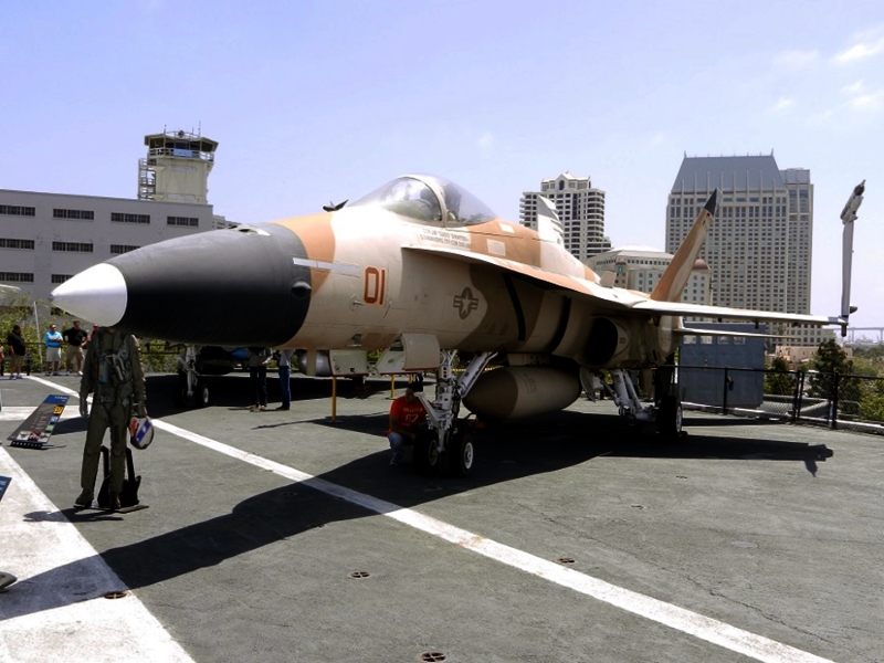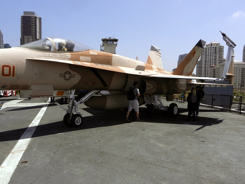 サンディエゴ港内に停泊する空母ミッドウェイ(CV-41)も博物館となり、アクセスが容易な事もあって人気の観光スポットです。「トップガン」のお膝元だけあって、館(艦)内では映画のDVDをガンガン流し、グッズの販売もしていました。その飛行甲板には数多くの海軍機が展示されていますが、アグレッサー部隊のF/A-18Aの姿もありましたので、併せて紹介します。