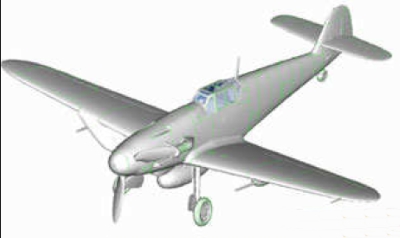 ④ 第2次大戦におけるドイツ空軍を代表する主力戦闘機です。初期の主力機E型を改良、エンジンをダイムラー・ベンツDB601E(1300hp)に強化、機体全面に空力的改良が施され1940年に登場した型式がBf109Fです。大きな性能向上が見られ、中期の主力戦闘機となりました。全長18.7㎝、全幅20.7㎝、パーツ数60以上、新金型。