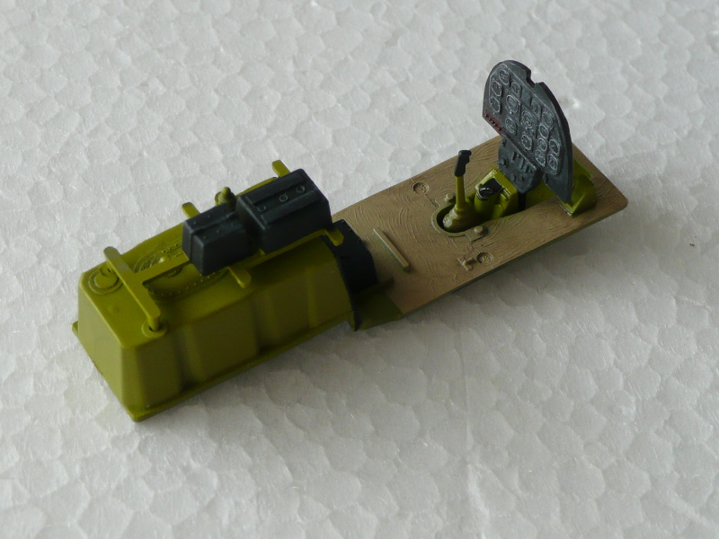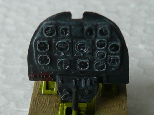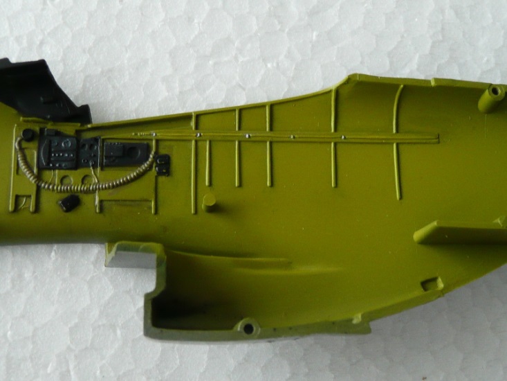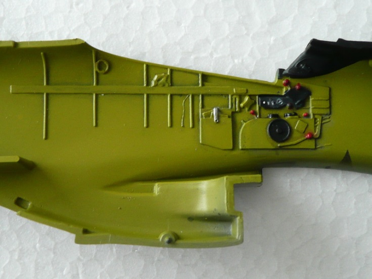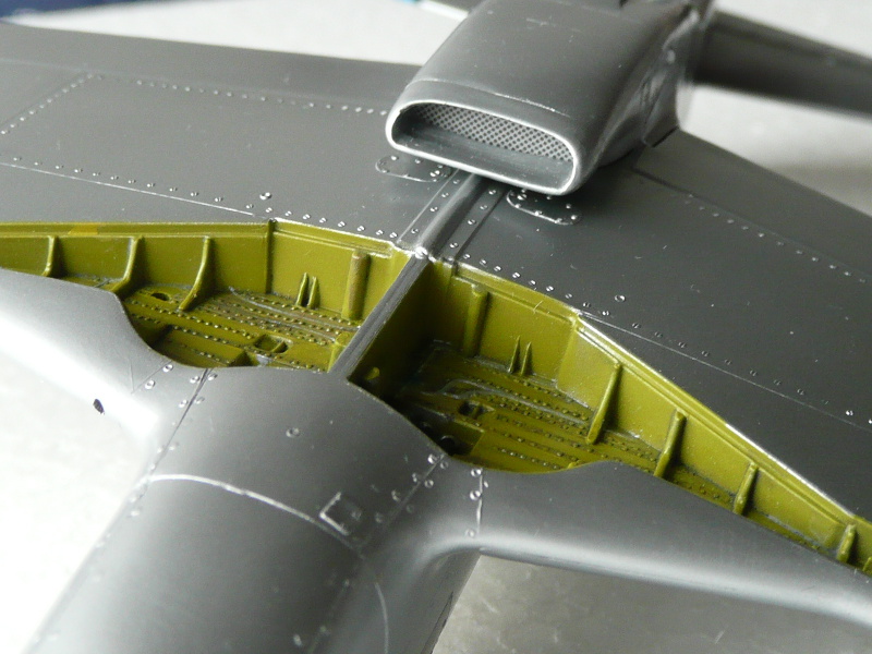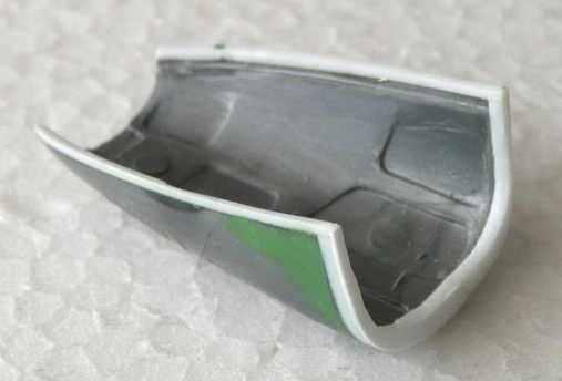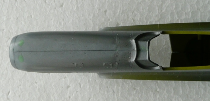 胴体の接着前に、コクピット、尾輪、そしてエンジン排気管を接着しなければなりませんが、尾輪だけは組み込み、コクピットと排気管は主翼取付け直前に取り付けることにしました。写真5が機首下面のエンジンカバーです。寸法を合わせるため、プラ板を貼ってサイズを大きくし、整形しています。写真6は、左右の胴体を貼り合わせ、整形した後の機首上面です。できるだけモールドを残す努力をしたのですが、一部のパネルライン、リベット、ビスなどが消えてしまいました。 |