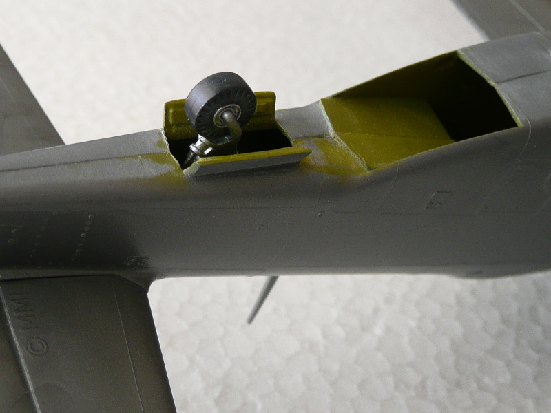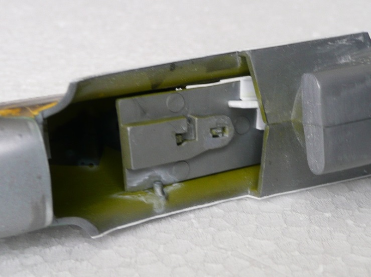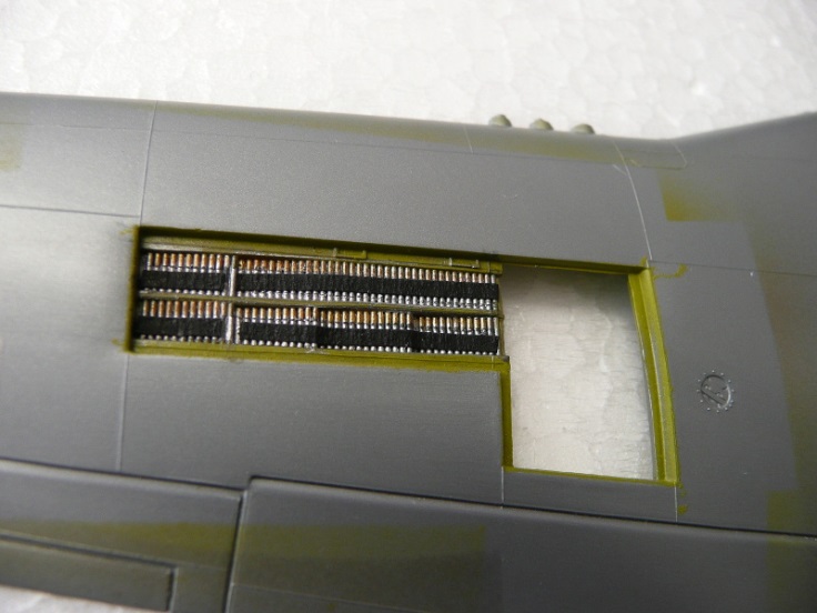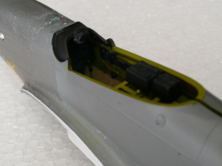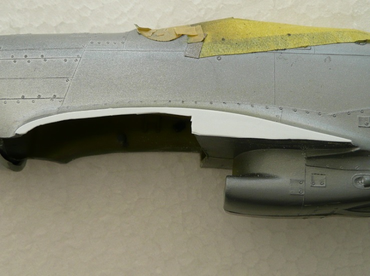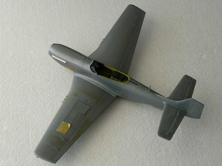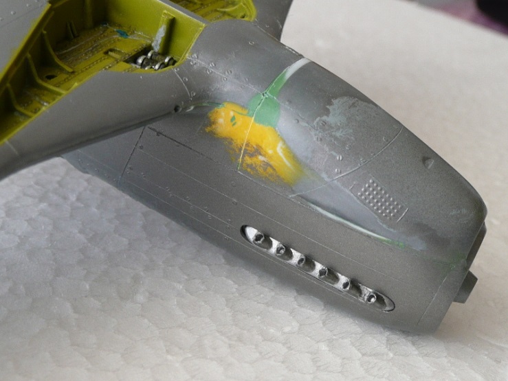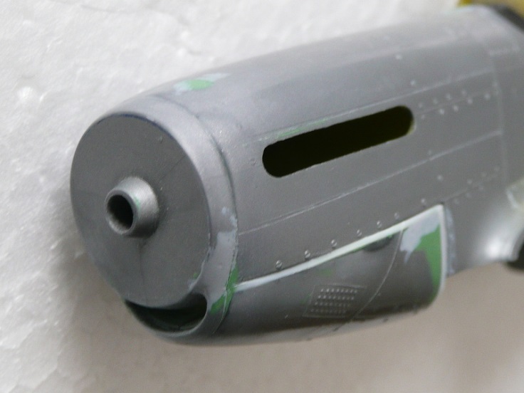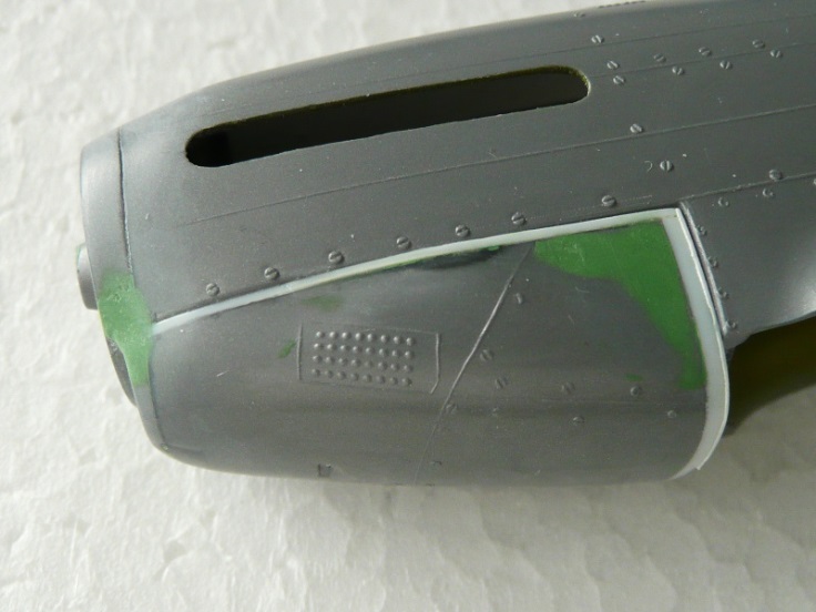 | 胴体の左右接着前に仮組をしてみたところ、機首下面のエンジンカバーと胴体の合いは極端に悪く、エンジンカバーの取り外しはあきらめ、接着してしまうことにしました。またエンジンナセル先端のパーツとナセル部の合いも悪く、パテ盛り修正は避けられない状況です。これでは折角のモールドも消えてしまいそうです。しかしまずはムスタングらしく見せるための作業が優先で、左右胴体の接着後、機首部の整形を行うことにしました。 |