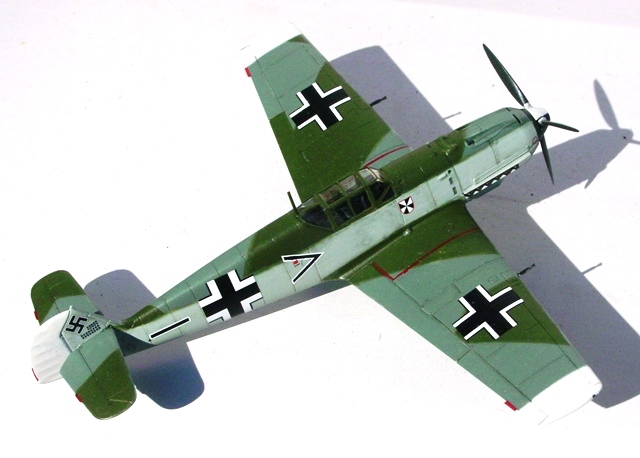 | 塗装はまたまた超テキト~である。主翼前縁は真っ直ぐに下面色が出ている指定だが、波線状にした。これは、まったくの個人的好み。色あいもそれなりで、考証なし。垂直尾翼のカギ十字は、図や箱絵のどこにも描かれておらず、付ける位置が分らない。安定板に棒状のマークがあるので、これにかからないように小さなマークを安定板に貼ることにした。 |