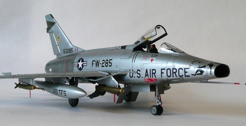 | F-100スーパーセイバーは、世界で初めての実用超音速戦闘機としてその名を航空史に残しただけでなく、超音速での運用という未知の世界を切り開いたパイオニアでもあると言えます。米空軍“センチュリー・シリーズ”のトップバッターとして、その開発技術が、その後の戦闘機開発に大きく貢献しています。生涯生産機数は2,000機を超え、米空軍の主力戦闘機の座にもつき、ヴェトナム戦争では戦闘爆撃機としての威力を発揮しました。量産型のバリエーションとしては、単座型がA、C、D、複座型にはTF-100CとF型があります。 |