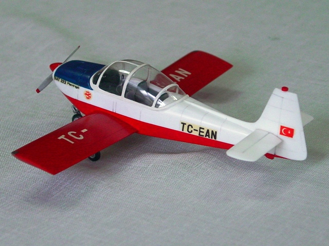 キットは白いプラと赤いプラで成形されている。胴体と水平尾翼は白い。そこで、白は必要な部分だけ塗り、全体は塗らないことにして手を抜く。主翼は赤い成形だが、これは表面がクタクタに歪んでいて、ヒケの大穴もある。翼端もヒケだらけでグニャグニャなので、どちらも滑らかにしないと見られない。これを基本において組み進める。 |