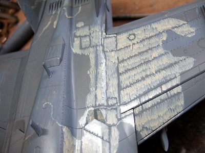 (写真11)塗装はまず裏面から。まずグレー系で下塗りをするのは、もはや寿スタンダードと言って良いのではないでせうか?(特にジェット)ほんでその上からキットの指定色をば塗ってまいります。最終的には更にその上から明度の高い色をエアブラシ。パネルラインを残すようにして、ベタ塗りをしない所がミソ。