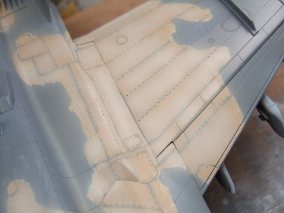 (写真20)アップにするとこんな感じ。黄土色の所はともかく、薄松葉色との境界線がアマい。エアブラシに頼らず筆オンリーでボカせば良かったかしら?