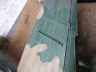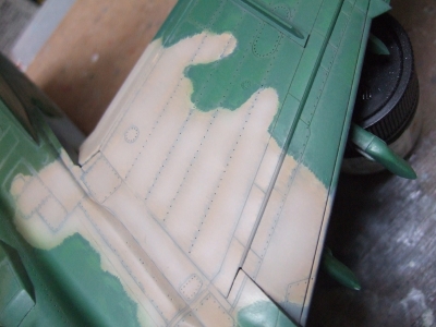 (写真19)濃松葉色塗ってエアブラシでボカして。エンジンセクションのパネルはネリ消しでマスクしてみました。入りくんでるしね。