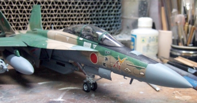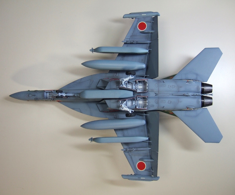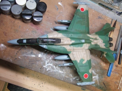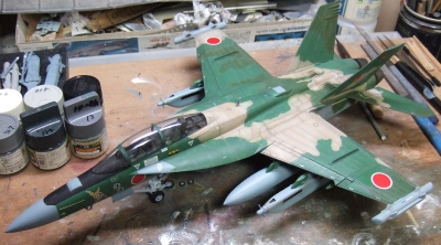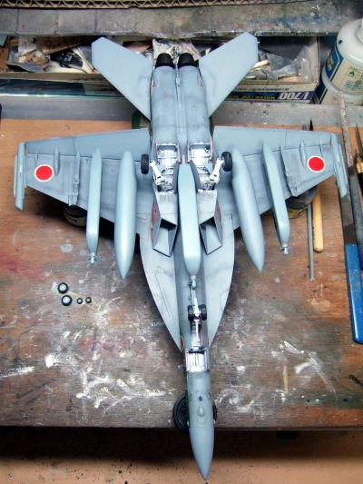 (写真18)デカール貼って装備品付けて、トップコート吹いたら出来上がり。うーん、なんかケバいぞ?日の丸がちょびっと自己主張しすぎのような・・・・でもまぁ、これはこれでアリってことで!ちょびっと古い空自の機体ってこんなニュアンスだよね。ね!?(たのむ、そうだと言ってくれ~)