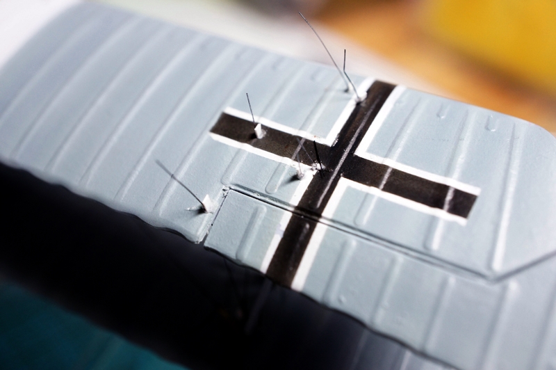0.4号のテグスをマジックで着色し、ターンバックルに結んだ上で上翼の孔に通し、0.2mmプラペーパで作った楔で固定します。