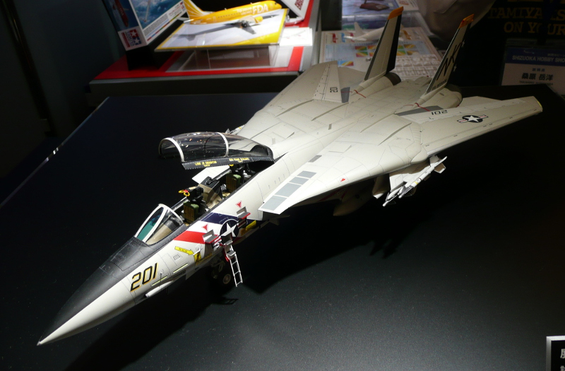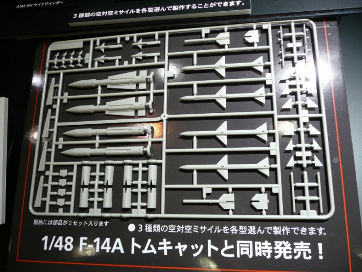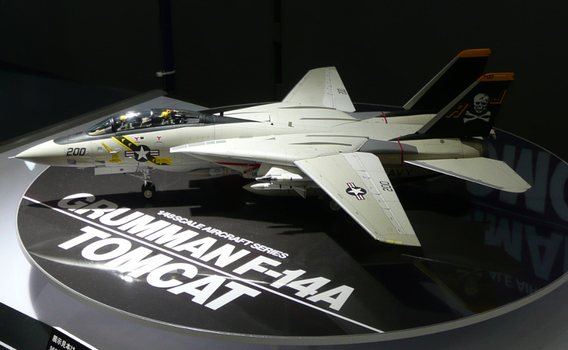 | タミヤからF-14の新キット(1/48)が発表されるとは、正直言って予想外でした。会場のタミヤのブースには、機首先端にピトー管のないF-14Aブロック65の完成品(VF-2のマーキング)と、機首にピトー管が設けられたブロック90の完成品(VF-84のマーキング)が展示されていました。但し、金型の一部はまだ開発中とのことで、光造形部品を使用しての組み立てとの注記がありました。展示されていた部品のテストショットを見る限り、主翼は可動で、1/32のキットのように動翼は固定のままでした。少し進歩が見られたのは、ウィンドシールドのクリアパーツの型割とインテイクからエンジンファンまでのダクトと思えるパーツが見られたことです。 |