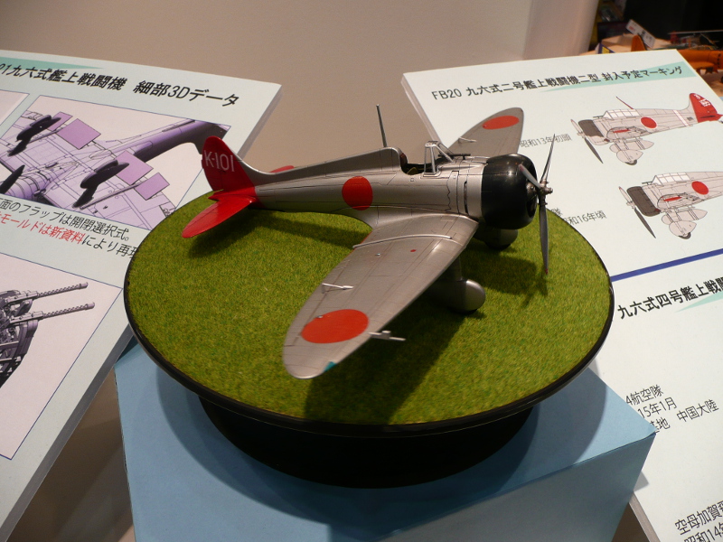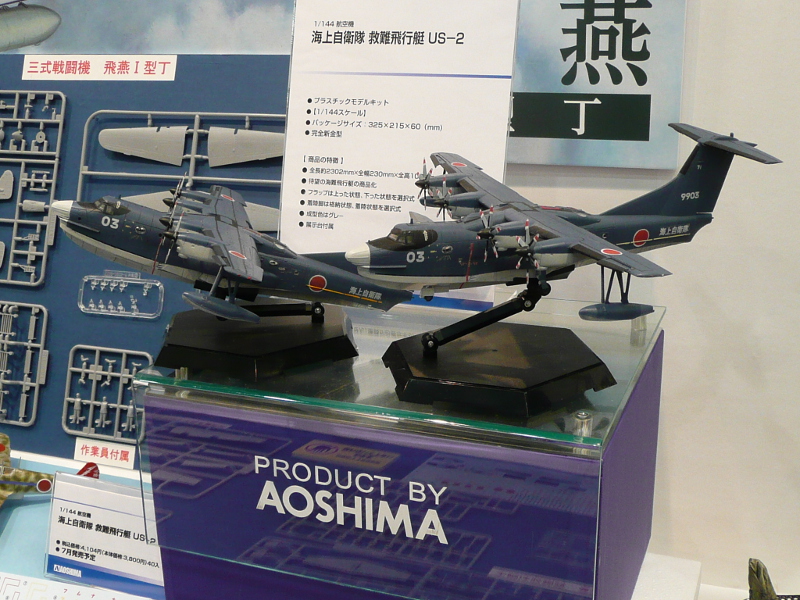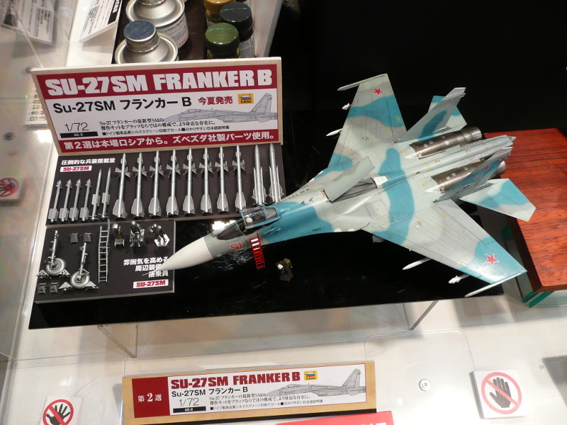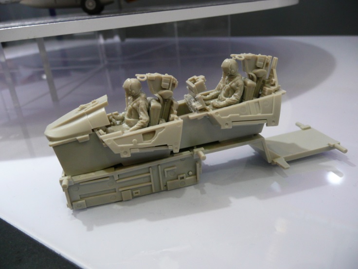 前者は、クリアパーツがウィンドシールド前方の機体の一部まで一体化されており、組み立てを考えたパーツ分割になっていると好感を持ちました。また後者は、1/32のキットではエンジンファンが筒抜けになっていたインテイクにダクトを追加し、実機に近い形状にしようとするもので、他社キットとの競争を考えると当然の結果かもしれません。コクピットは単体で素組品が展示されていましたが、パイロットのフィギュアはよくできているように見えました。ただ搭載兵装が別売だとのことで、価格がどうなるのか注目されます。まだ開発中であり、今後どのように変化するかは予測がつきませんが、既に同一スケールでF-14シリーズの発売を予告しているアバンギャルドとの競合となり、その動向に目が離せません。 |