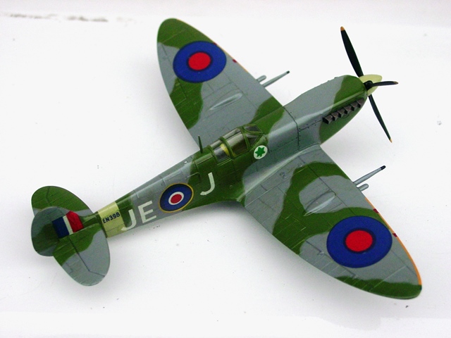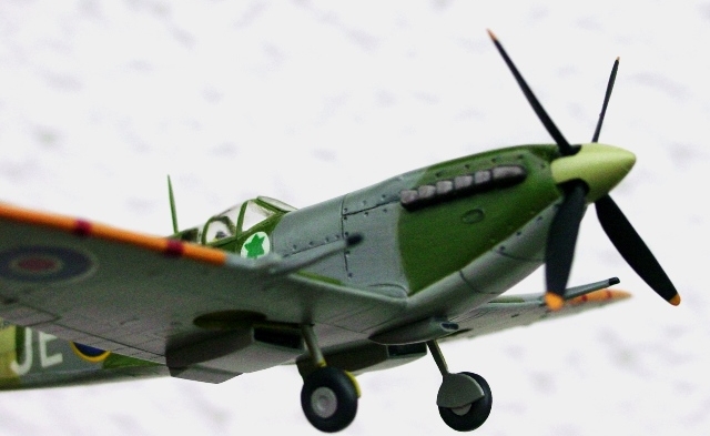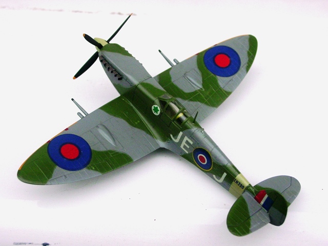 | パーツの改善が終われば、あとは組めばよい。コックピットは椅子だけなので、胴体左右をすぐに接着。その後で機内色をテキト~に塗る。主翼は1枚モノだから、右翼・左翼の2パーツのみ。ヒケはないし、楕円翼の形状もいい感じ。スピットファイアは実機が薄翼なので、1枚モノでも気にならない。上反角は7°と図示してあり、胴体につけてみるとそのくらいの角度になる。そうはいっても多少の隙間ができたので、ガイドの板を切断して面を整形する。これで接着する。その時に後縁側は上面位置で合せる。固着してから下面を削り上げる際に一緒に削れば、きれいな形に整形できる。前縁も同じで、これも後から下面側を整形するとつながりがきれいに見える。 |