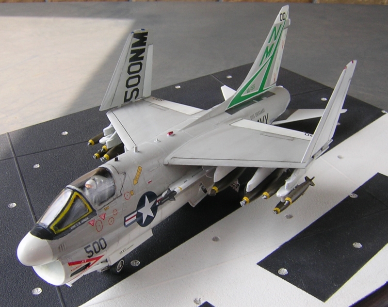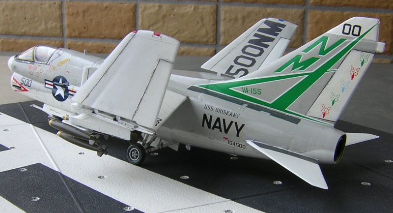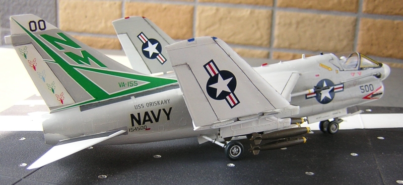 | さて、これで士の字になったので塗装に入ります。いつものように筆塗りで上面ライトガルグレー、下面インシグニアホワイトはミスターカラーをそのまま使用。ウオークウエイはブラックグレーを使用しました。筋彫りした動翼部にはタミヤのスミ入れブラックを流し込んでおきます。マーキングは昔から作ってみたかったVA-155をチョイス。約40年前に購入しておいたマイクロの72-81を使用しました。若干黄ばんでいましたがマイクロリキッドフィルムを使わずとも普通に使用できました。さすがマイクロ!と褒めたところで「あれっ?VA-155って第5スコードロンだから、モデックスは500番台じゃなかったっけ?マイクロは400番になっているぞ。」 |