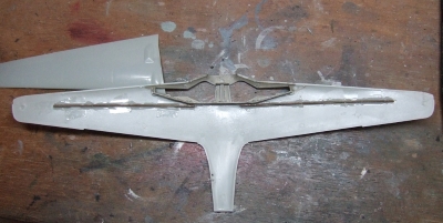 (写真4) プラが薄いせいかそれとも翼が細長いからか、妙に反ってるタンクの主翼。コンロの熱で無理矢理矯正して、真鍮線で補強してみたところです。まぁこのサイズだし、これで充分かな、と。