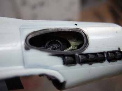 (写真2) でも涙を呑んでこれを封印!インテークのパーツを取り付ける前ならば、こうしてまだこのすばらしいエンジンの一部を覗くことが出来ます。が、これが今生の別れ。「さらばだ、友よ」死者を送る水路から盟友ショウキを見送るファルコもこんな気持ちだったんでしょうかね?