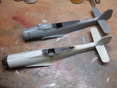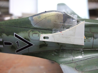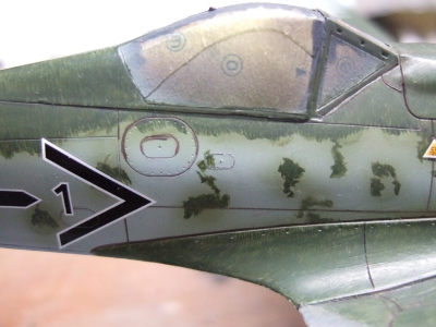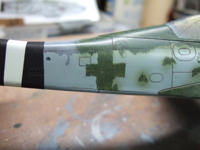 (写真14) グリーン系に移行。あと、古い金型のせいかキャノピーに傷が目立ちますね。第一風防は兎も角、問題は第二風防ですなぁ。磨き倒すのが面倒なんで、余っていたタミヤ版フォッケのキャノピーをちょびっと手直しして貼り着けてます。(前作、A8R2仕様の残り。キャノピーのマスクもタミヤのそれ)