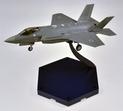 ④ 世界の空で活躍している現用機を1/144スケールでモデル化した新シリーズです。すべてのパーツは塗装済みで胴体は組み立て済み、そのほかは簡単な組み立てですから、どなたでも手軽に現用機の美しいスタイルを楽しんでいただけます。さらに編隊で展示ができるヘキサゴンスタンドも付いています。№3は、わが国 航空自衛隊に導入される予定のF-35AライトニングⅡで、2016年8月に初飛行した初号機(69-8701号機)をモデル化しました。日本の空の守りに大きな力を発揮することが期待される革新的な第5世代戦闘機を心ゆくまでお楽しみください。