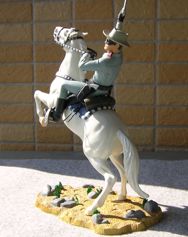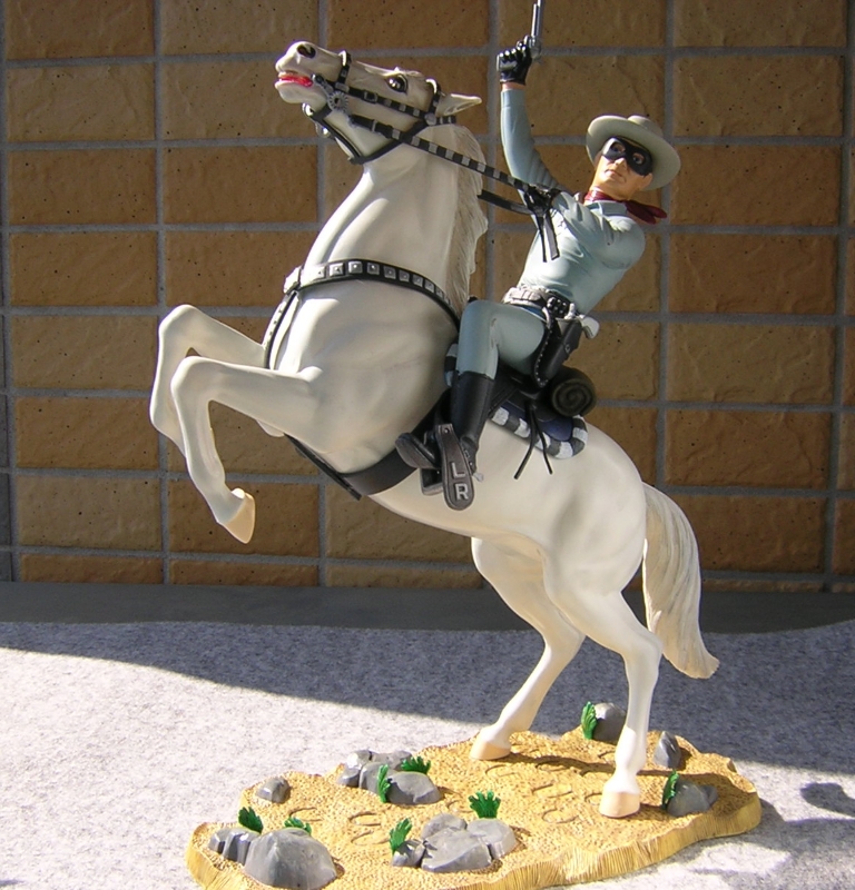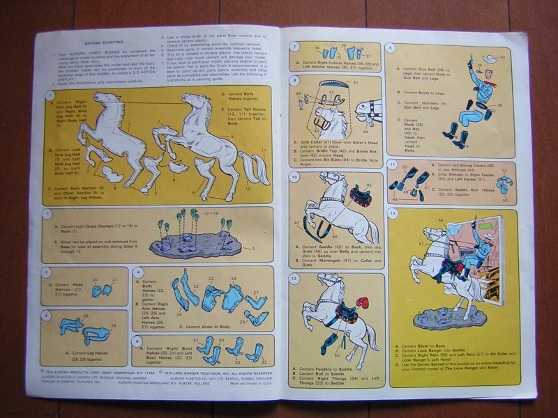 | まずは愛馬シルバーの製作から入ります。これだけで11個のパーツで構成されています。全身のデッサンの正確さ、筋肉の動き、顔の表情どれをとっても素晴らしいの一言です。実はこの馬は1965年にスタリオンとして野生動物シリーズの一つとして先に発売されていた物の転用だったのですね。怪傑ゾロのキットにも転用されております。とにかく50年以上前のものとは思えないモールドですが、いかんせん成形技術が追い付いていないので組み立てるとあちこちに隙間や段差ができてしまいます。これをモールドを消さないよう整形することがオーロラフィギュアの一番難儀なところです。パテ盛りとヤスリがけの繰り返しでなんとかできあがったなら、この時点で塗装に入ります。全身白ですが純白に塗装するとオモチャぽく見える気がしたので私はミスターカラーの311番ベトナム迷彩下面色を筆塗りしました。白モールドなので2度塗りで十分です。 |