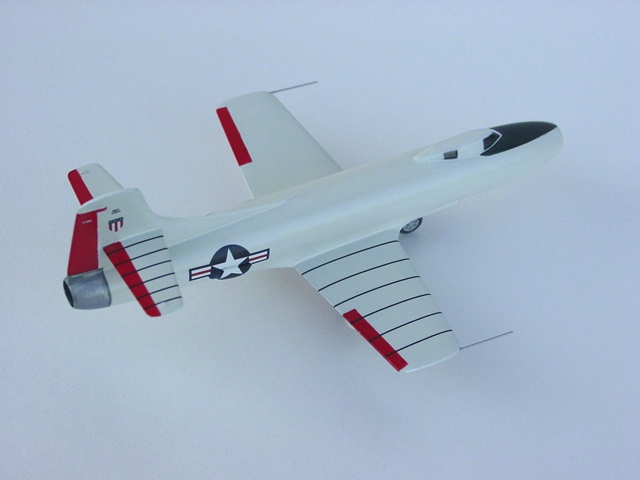 そのためか、筒型の胴体とプロペラがないので地上高が低いこと以外は、どうってことない小さな直線翼と、そのころのダグラス機にソックリの尾翼周りだといえる。緊急脱出は機首ごと離脱するのだというが、これはプラモデルでは分らない。