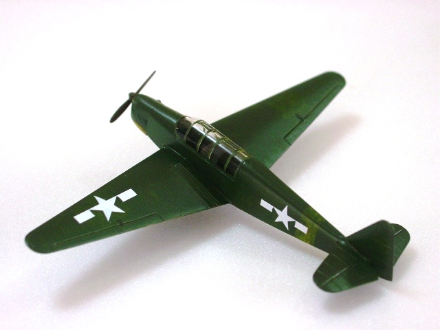 胴体と主翼を接着する。上反角はキットに従う。胴体と接する主翼後縁が甘くて僅かだが欠損が生じるので、ランナーから小片を切り取ってそこに瞬間接着剤で着ける。あとで整形する。簡易インジェクションキットならば通常範囲。 水平尾翼は、台座が別パーツ。削って胴体に組み込む。これに水平尾翼を水平に、かつ主翼とねじれないように接着する。右側の水平尾翼は平面形が前に出てしまうので、ここは水平尾翼側の取付け面を切って調整する。微妙に左右の平面形が違うことになるが、この程度は「普通」の範囲内。